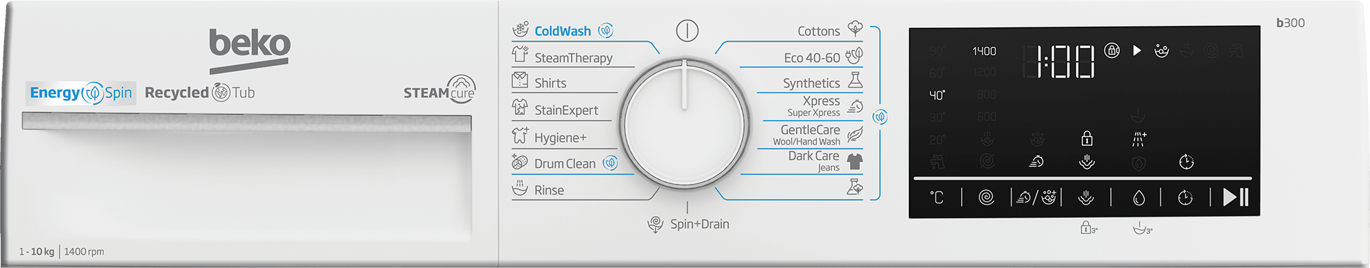 Pralni stroj Beko vsebuje tehnologijo EnergySpin, ki prihrani energijo v vseh programih pranja. EnergySpin tako z dinamičnimi premiki bobna, izboljšuje raztapljanje detergenta in posledično prihrani do 35% energije pri vseh programih in ne samo pri Eco programu.