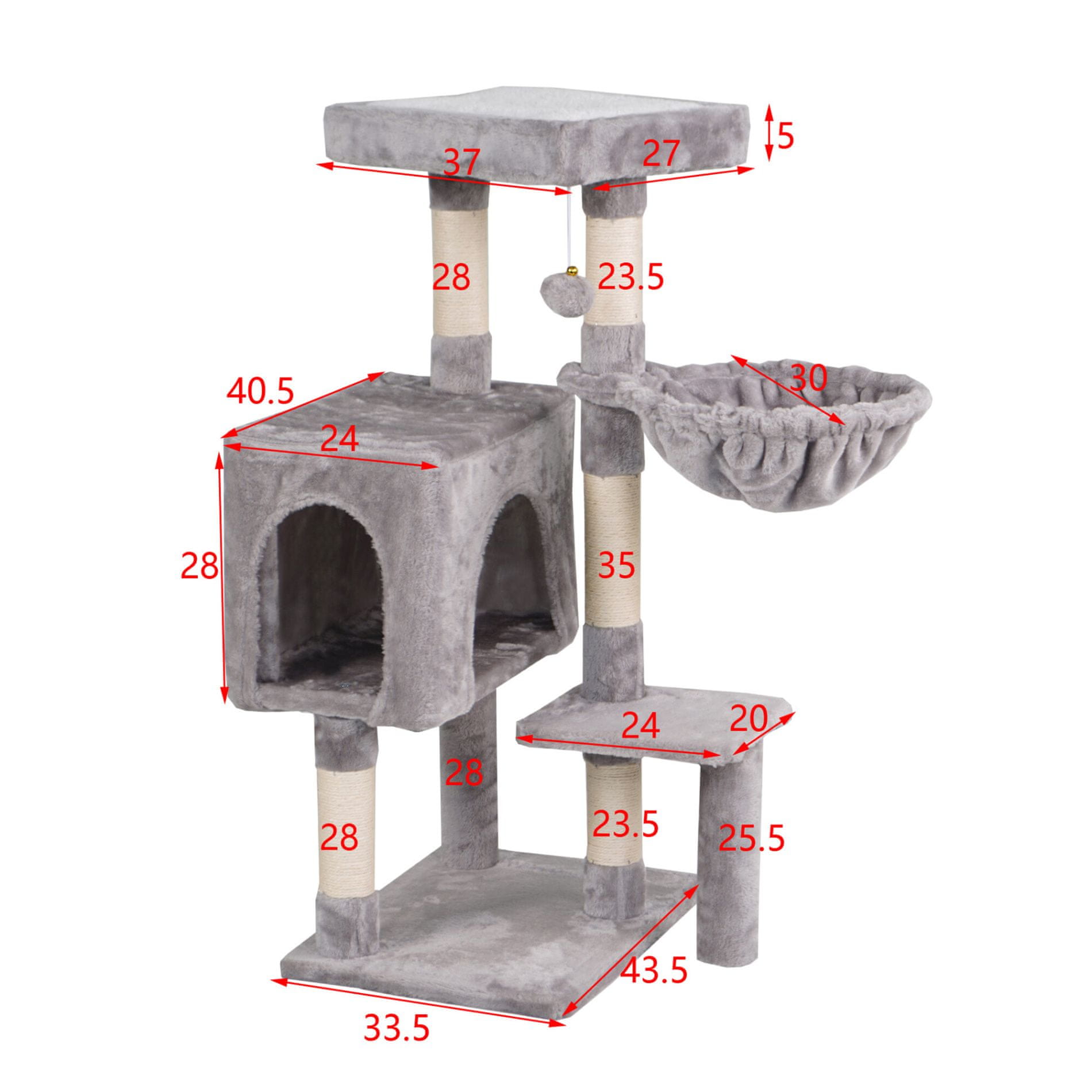 • Praskalnik vsebuje: 1 hiško za možnost skrivanja, 3 počivališča, igrače kosmate žogice pritrjene na elastičnih vrvicah in stebričke delno prekrite s sisalom