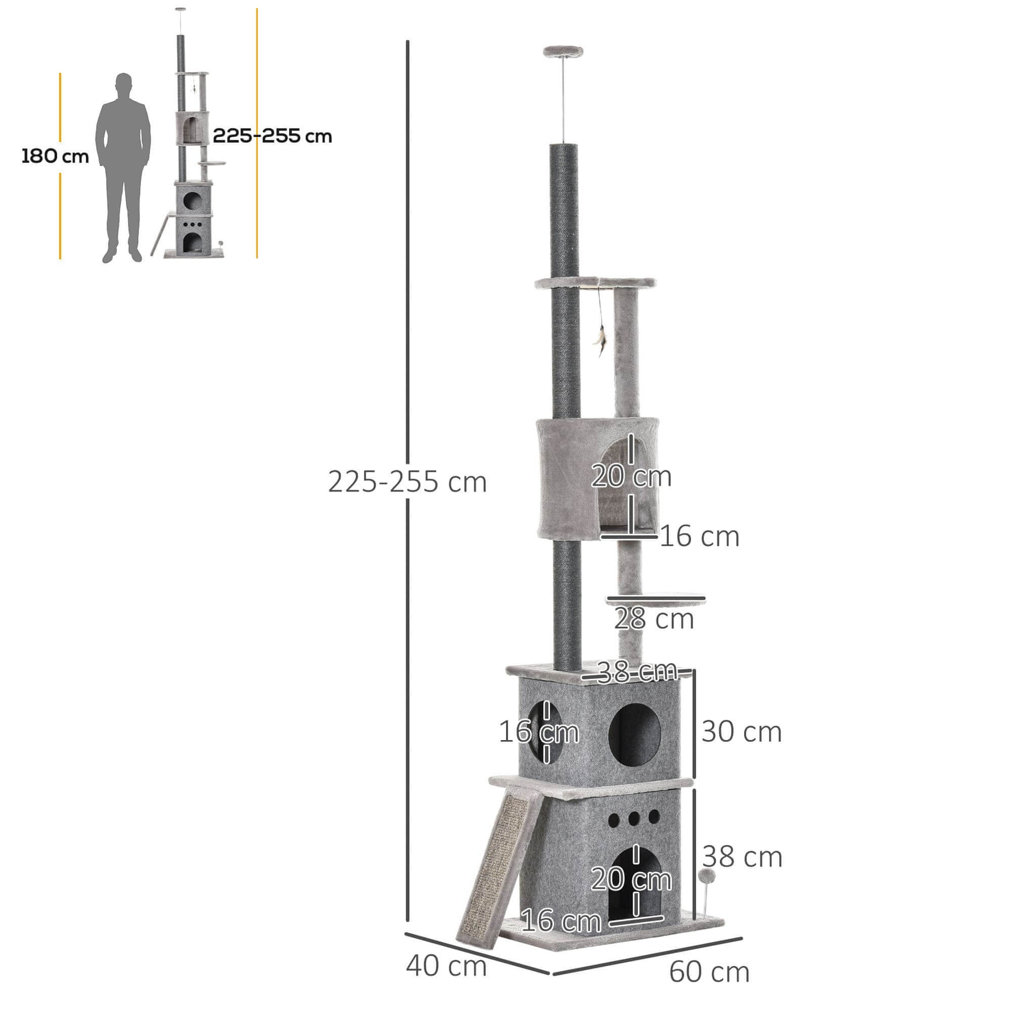 Ta stropna mačja drevesa ponuja večfunkcijski prostor za majhne mačke za igro počitek in ostrenje krempljev. Zasnovano z več nivoji mehko plišasto prevleko in vgrajenimi praskalnimi stebri zagotavlja udobno in privlačno okolje za vaše mačje prijatelje. Nastavljiva višina in stabilna konstrukcija omogočata uporabo v različnih bivalnih prostorih kar zagotavlja varnost in užitek za vaše ljubljenčke. Barva: svetlo siva Material: iverna plošča sisal pliš Celotne dimenzije: 60L x 40P x 225–255V cm Velikost podnožja: 60L x 40P cm Velikost mačje hišice iz filca: 34L x 34P x 38V cm Velikost odprtine vrat: 16L x 20V cm Velikost drugega nivoja: 44L x 38P cm Mačja hišica iz filca: 44L x 38P x 40V cm Velikost okrogle odprtine vrat: Ø16 cm Velikost praskalne deske: 45L x 16P cm Velikost tretjega nivoja: 38L x 38P cm Velikost četrtega nivoja: Ø28 cm Velikost mačje hišice na petem nivoju: Ø34 x V29 velikost odprtine vrat: 16L x 20P cm Velikost četrtega nivoja: Ø38 cm Stebri iz sisalove vrvi: Ø69 cm Primerno za mačke do 45 kg