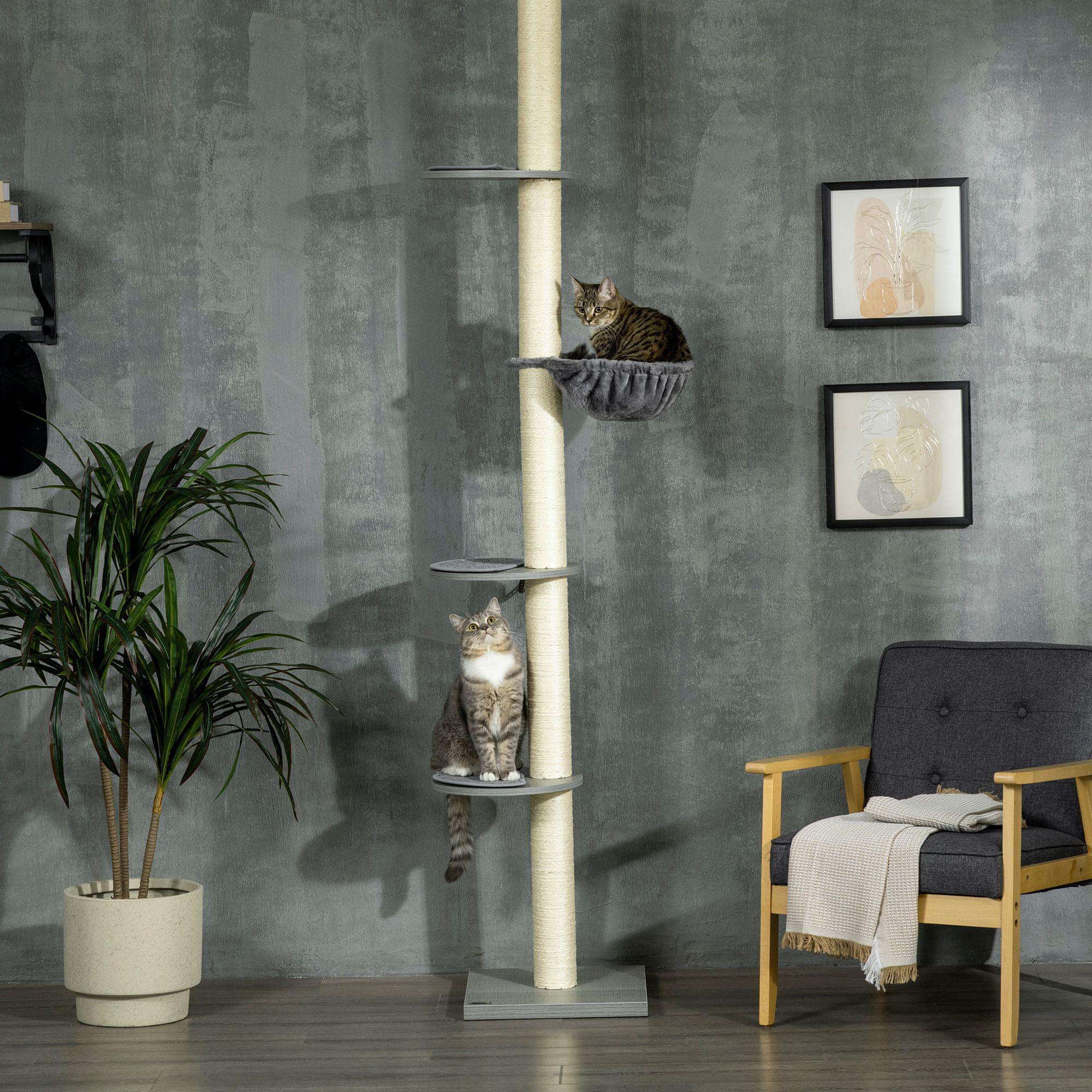 Ta stropna mačja drevesa je zasnovana tako da vašim mačjim spremljevalcem nudi zanimiv in udoben prostor za plezanje praskanje in sproščanje. Z več platformami visečo mrežo in praskalnimi stebri je idealna za aktivne mačke in gospodinjstva z več mačkami. Trdna konstrukcija in mehka plišasta prevleka zagotavljata varnost in udobje za vaše ljubljenčke.