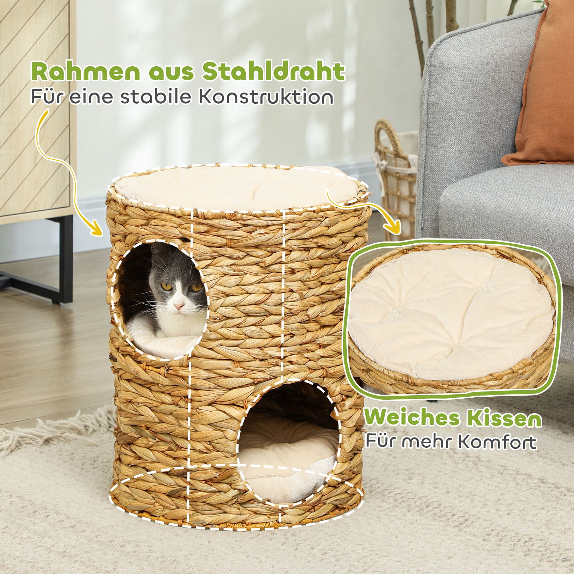 Ta udoben sod za praskanje mačk nudi vašim mačjim spremljevalcem popoln prostor za sprostitev igro in opazovanje okolice. Z dvema udobnima skrivališčema in mehko oblazinjeno zgornjo platformo zagotavlja tako zabavo kot varen kotiček za mačke. Naravni dizajn iz vodne hijacinte se brezhibno zlije z vsakim domačim dekorjem kar ga naredi privlačen in funkcionalen dodatek vašemu bivalnemu prostoru. Barva: svetlo rjava Material: jeklo vodna hijacinta žametna tkanina (100 % poliester) Skupne dimenzije: Ø40 × 50V cm Notranja višina: 22 cm (vsaka raven) Velikost odprtine: Ø18 cm Dimenzije blazine: Ø38 × 6V cm Primerno za mačke do 35 kg Ni potrebna montaža