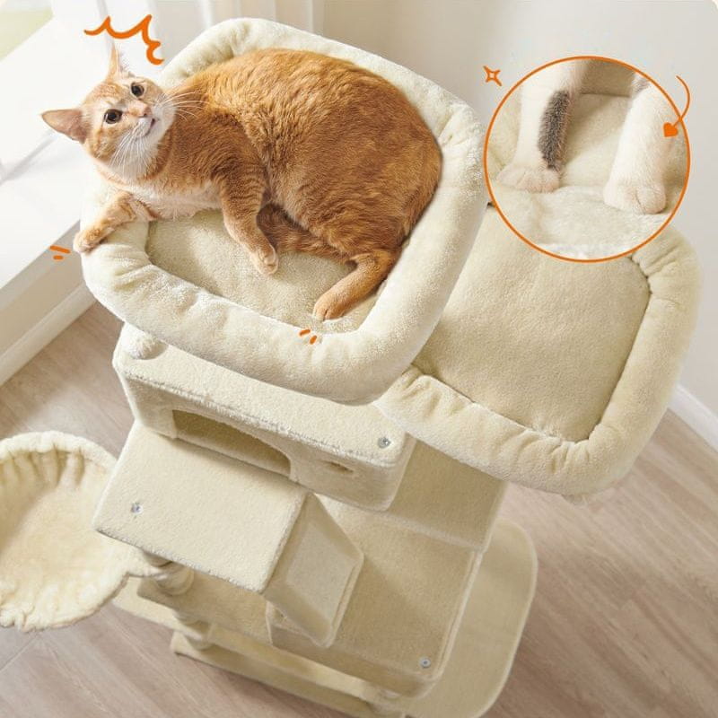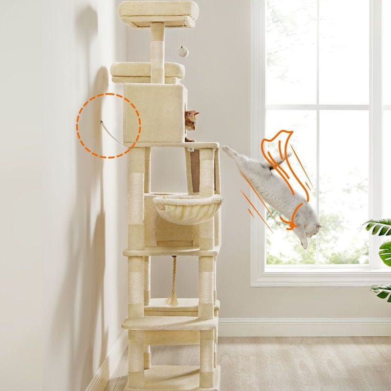 S tem velikim drevesom za mačke Feandrea zagotovite svoji mački popoln prostor za igro in sprostitev. To mačje drevo s skupno 13 praskalniki, dvema udobnima gredicama, visečo mrežo in košaro ponuja neskončno možnosti za plezanje, igro in počitek vaše mačke. Zaradi trdne konstrukcije in mehke plišaste prevleke je popolno zatočišče za vašega mačjega prijatelja. Ne glede na to, ali se želi vaša mačka raztegniti, praskati ali samo zadremati, ima to mačje drevo vse, kar potrebuje.
