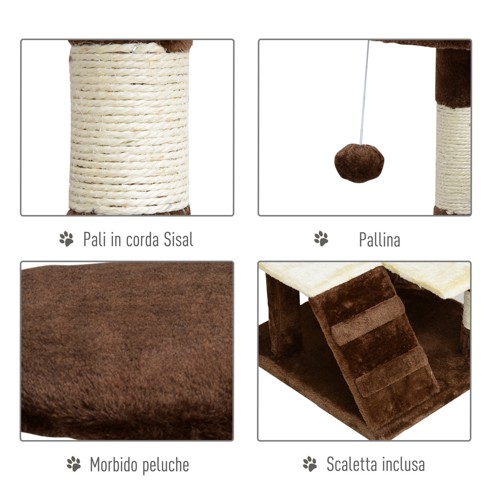 VEČNAMENSKO DREVESO ZA MAČKE: To drevo za mačke s sisalnimi drogovi, ploščadmi, veliko hiško, rampo in žogicami je idealno mesto za zabavo in počitek tvojih štirinožnih prijateljev! VARUJ SVOJE MEBLE: Trpežni in naravni sisalni praskalniki so popolni za brušenje krempljev tvojih mačk, ki bodo pozabili brusiti na kavču ali na tvojem pohištvu. MEHKA OBLOGA: Ta mačja telovadnica je obložena z mehkim plišem, ki nudi udobje med njihovimi dremeži. TRPEŽNO IN VARNOSTNO: Drevo za praskanje mačk je izdelano iz trdnih iverk E1, ki ga ohranjajo stabilnega, je netoksično in varno za tvoje živali. VELIKOST: Splošne dimenzije: 50D x 50Š x 132V cm. Dimenzije hiške: 50D x 25Š x 25V cm (velika), 21D x 21Š x 20V cm (mala). Mehko praskalno drevo, namenjeno zabavi tvojega štirinožnega prijatelja, z hiškami in ploščadmi na več ravneh, povezanimi z mehkimi plišastimi rampami. Mali zabaviščni park za tvoje mačke, kjer se lahko igrajo, skrivajo, spijo ali brusijo kremplje, ne da bi poškodovali pohištvo v hiši. • Udobno drevo za praskanje z hiškami in ploščadmi na več ravneh, povezanimi z mehkimi plišastimi rampami.;
