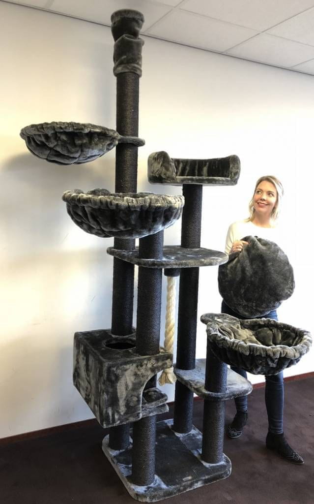 Plišasta površina mačjega drevesa je zelo udobna, drogovi za praskanje pa so obdani z vrvjo iz sisala. Mačje drevo , razgledne platforme in prostor za počivanje, zato bo zagotovo zabavalo vašega malega prijatelja. Osnova je močna in stabilna. To mačje drevo je primerno za več mačk.
