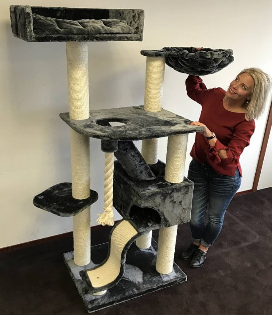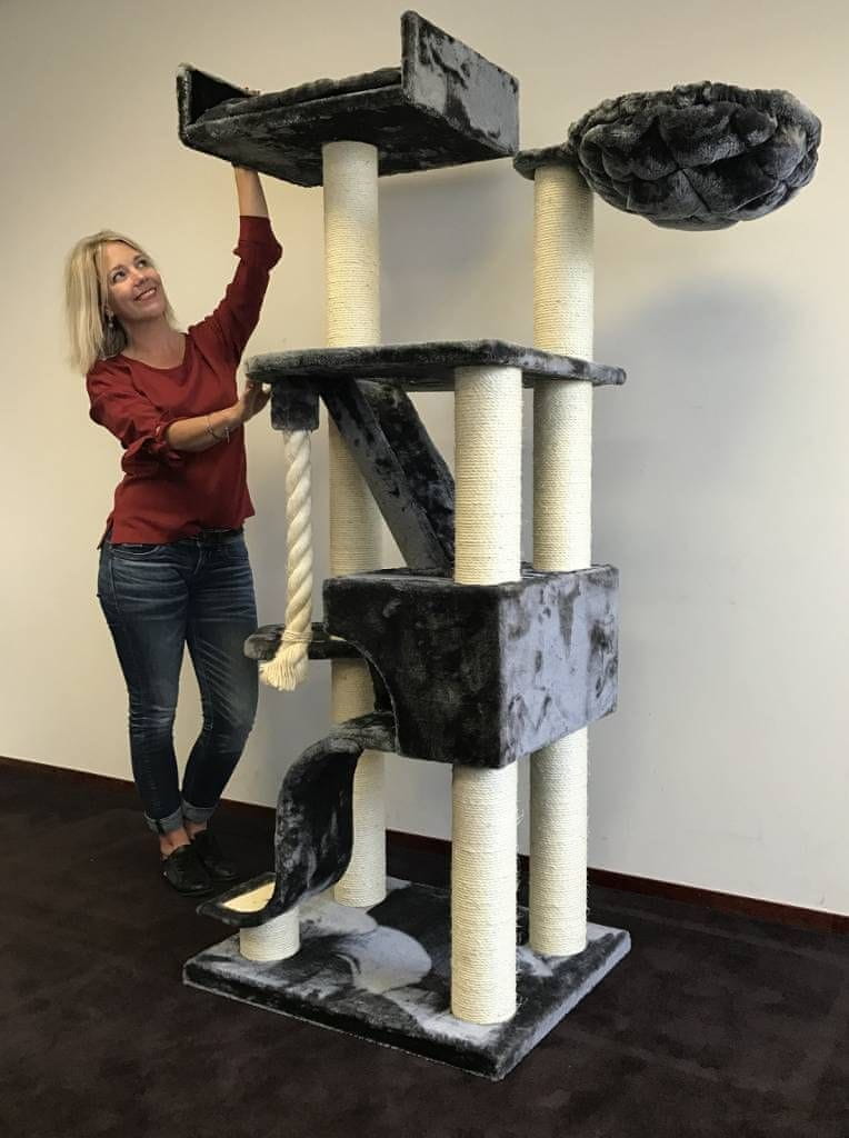 Plišasta površina mačjega drevesa je zelo udobna, drogovi za praskanje pa so obdani z vrvjo iz sisala. Mačje drevo , razgledne platforme in prostor za počivanje, zato bo zagotovo zabavalo vašega malega prijatelja. Osnova je močna in stabilna. To mačje drevo je primerno za več mačk.