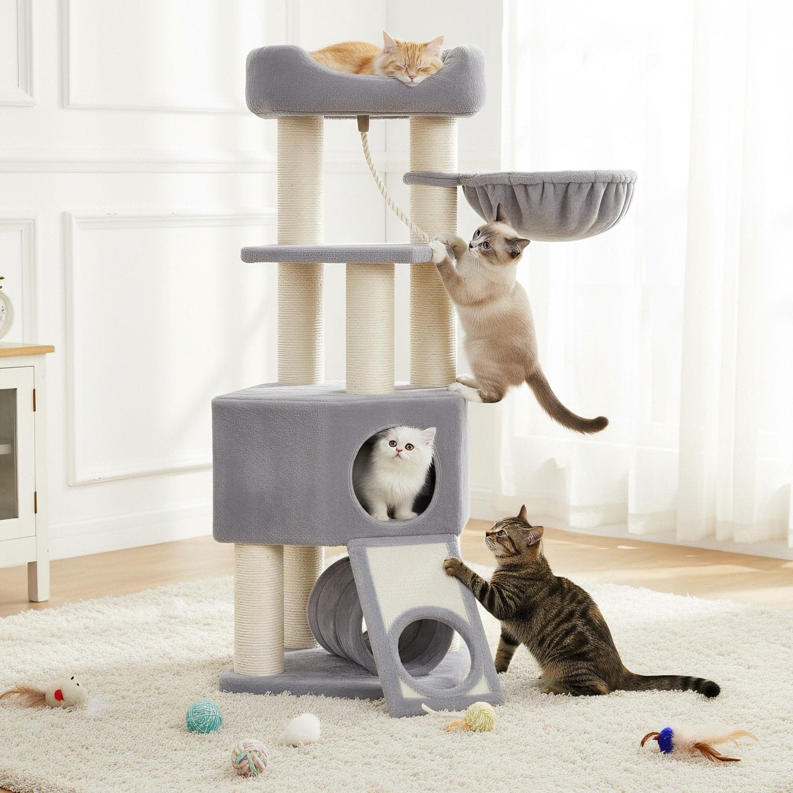 Ta velik mačji drevo nudi udoben in zanimiv prostor za vašo mačko za igro praskanje in počitek. Vsebuje več nivojev vključno s prijetno jamo visečo mrežo plišasto platformo tunelom in sisalnimi stebrički za zadovoljevanje praskalnih instinktov. Oblikovan za stabilnost in vzdržljivost primeren za gospodinjstva z več mačkami in pomaga zaščititi vaš pohištvo.