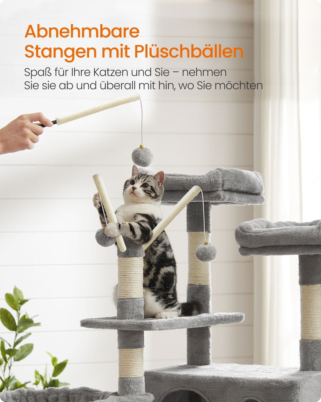 Ta mačje drevo je zasnovano tako da zagotavlja udobno in zabavno okolje za vaše mačke. Ponuja več platform prijetna skrivališča in igralne elemente zaradi česar je idealno za gospodinjstva z do dvema mačkama. Trdna konstrukcija in mehka plišasta prevleka zagotavljata varnost in sprostitev za vaše ljubljenčke.