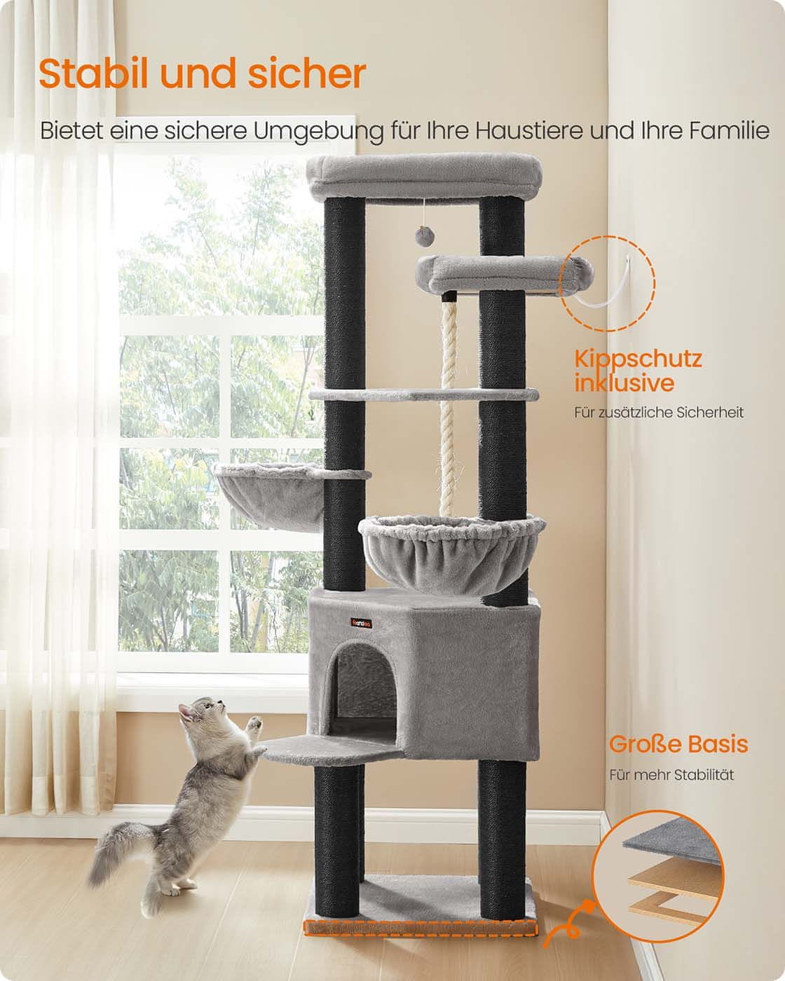 Ta velika večnivojska mačja drevesa je zasnovana tako da zagotavlja dovolj prostora in zabave za velike mačke kot so Maine Cooni. Z robustno konstrukcijo in debelimi sisalnimi stebri ponuja trdno okolje za praskanje plezanje in počivanje. Nevtralna barvna shema golobje sive in kremno bele barve omogoča da se brezhibno zlije z različnimi notranjostmi doma.