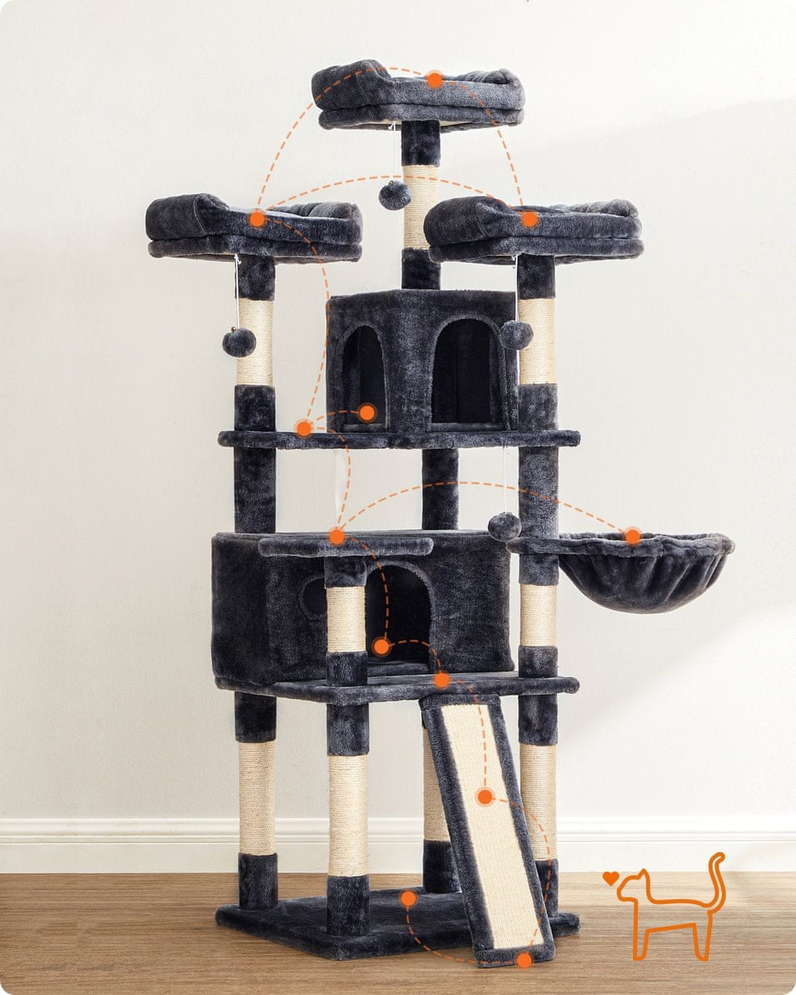 Ta velika mačja drevesa ponuja več platform, udobna skrivališča in površine za praskanje, kar vašim mačkam zagotavlja veliko prostora za igro, počitek in zadovoljevanje njihovih naravnih nagonov. Njena robustna zasnova zagotavlja stabilnost in udobje za vaše mačje prijatelje. Celoten opis