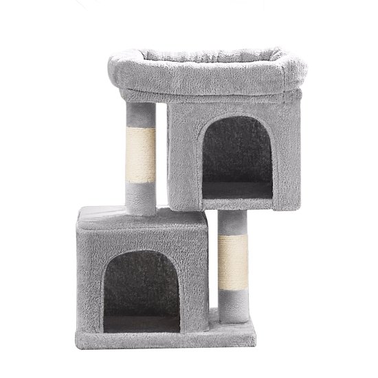 To drevo za mačke je zasnovano tako, da mladičem in manjšim mačkam nudi udoben in zanimiv prostor za plezanje, praskanje in sprostitev. Z obsežnim ležiščem, dvema udobnima votlinama in več praskalnimi stebri nudi varen in vsestranski prostor za notranje mačke. Njegova trdna konstrukcija in stabilna osnova zagotavljata varnost in vzdržljivost, zaradi česar je praktičen dodatek vsakemu domu.