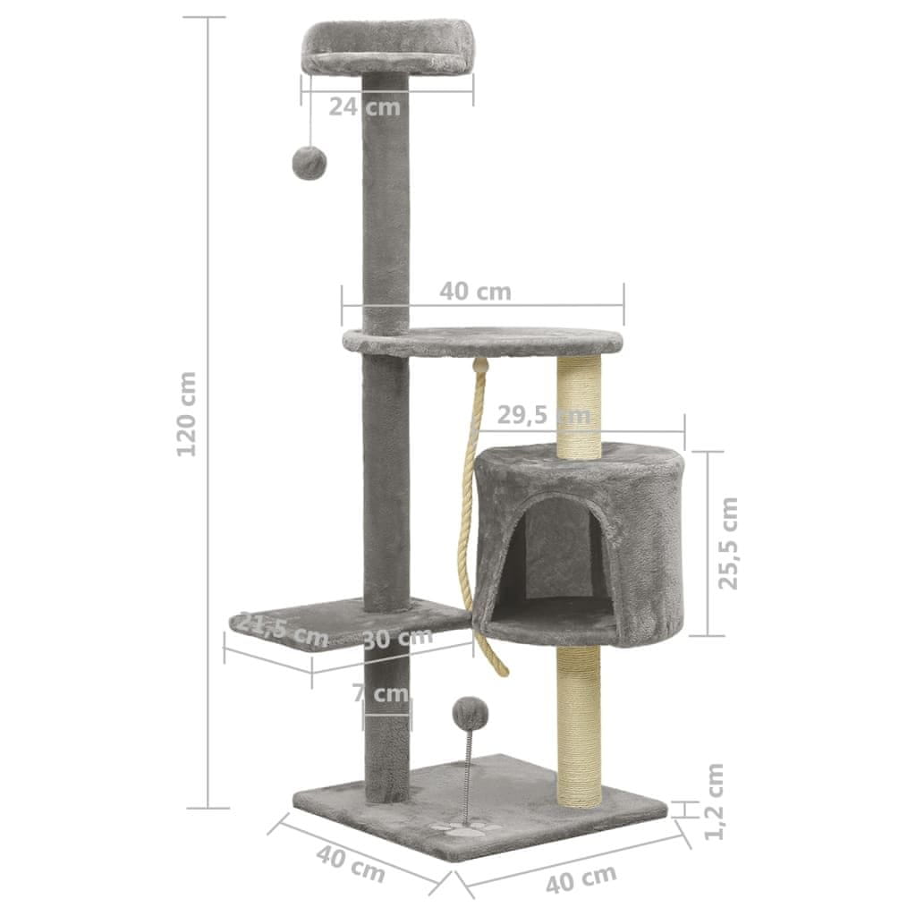 Vidaxl Mačje drevo s praskalniki iz sisala sive barve 120 cm