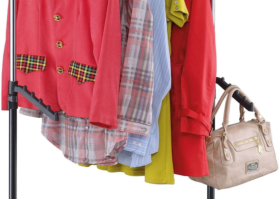 Enoročno stojalo za obleke z nezaklepnim potovanjem iz kromirane/črne kovine in plastike ter praktičnim predalom za shranjevanje, sestavljenim iz dveh kovinskih povezovalnih cevi in dveh visečih rok za obešanje torbic, torbic, kravat in podobnih oblačilnih dodatkov. Obračajo se za 360° in so nameščeni na navpičnih podpornih kovinskih palicah. Priporočena nosilnost je 5 kg enakomerno porazdeljene obremenitve na roko. Stojalo je zasnovano za uporabo v gospodinjstvu in ni namenjeno za težka dela. Nastavljiva višina. Dobavljen je razstavljen.