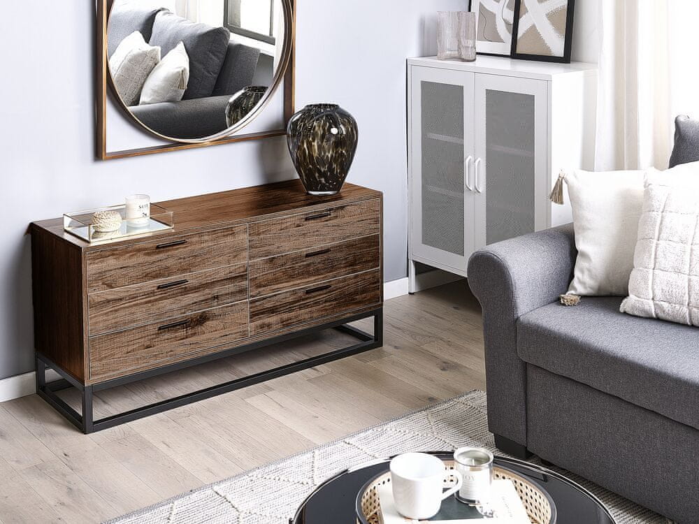 Rustikalna, boho, industrijska ali minimalistična, ta vsestranska omara stilsko dopolnjuje skoraj vsak sodoben prostor. Izdelan je iz visokokakovostnega umetnega lesa in ima lesen zaključek v temnem tonu, ki bo z naravnim poudarkom ogrel vsak prostor. Ima šest prostornih predalov, v katerih je dovolj prostora za shranjevanje vseh vrst dodatkov ali oblačil. Zaradi širokega vrha lahko služi tudi kot stojalo za televizor, ki dela čudeže zlasti v notranjosti z majhnim prostorom.