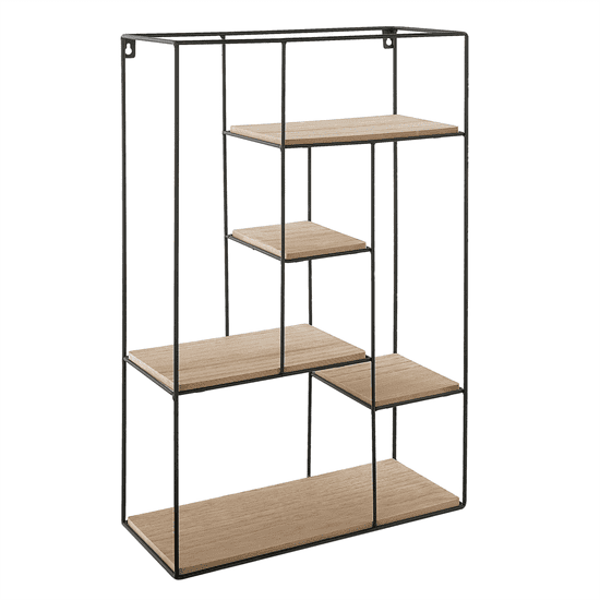 Dekorativni in praktični dodatek za vsak prostor. Viseča polica s policami lahko služi kot knjižna omara, polica za rože ali samo za shranjevanje predmetov. Preprosta geometrijska konstrukcija iz črne žice in asimetrično razporejene lesene police tvorijo harmonično, elegantno celoto, ki vas bo navdušila s svojo lahkotnostjo. Zaradi svojega videza ni le polica za razstavljanje vaših najljubših malenkosti, temveč je tudi lep stenski okras.
