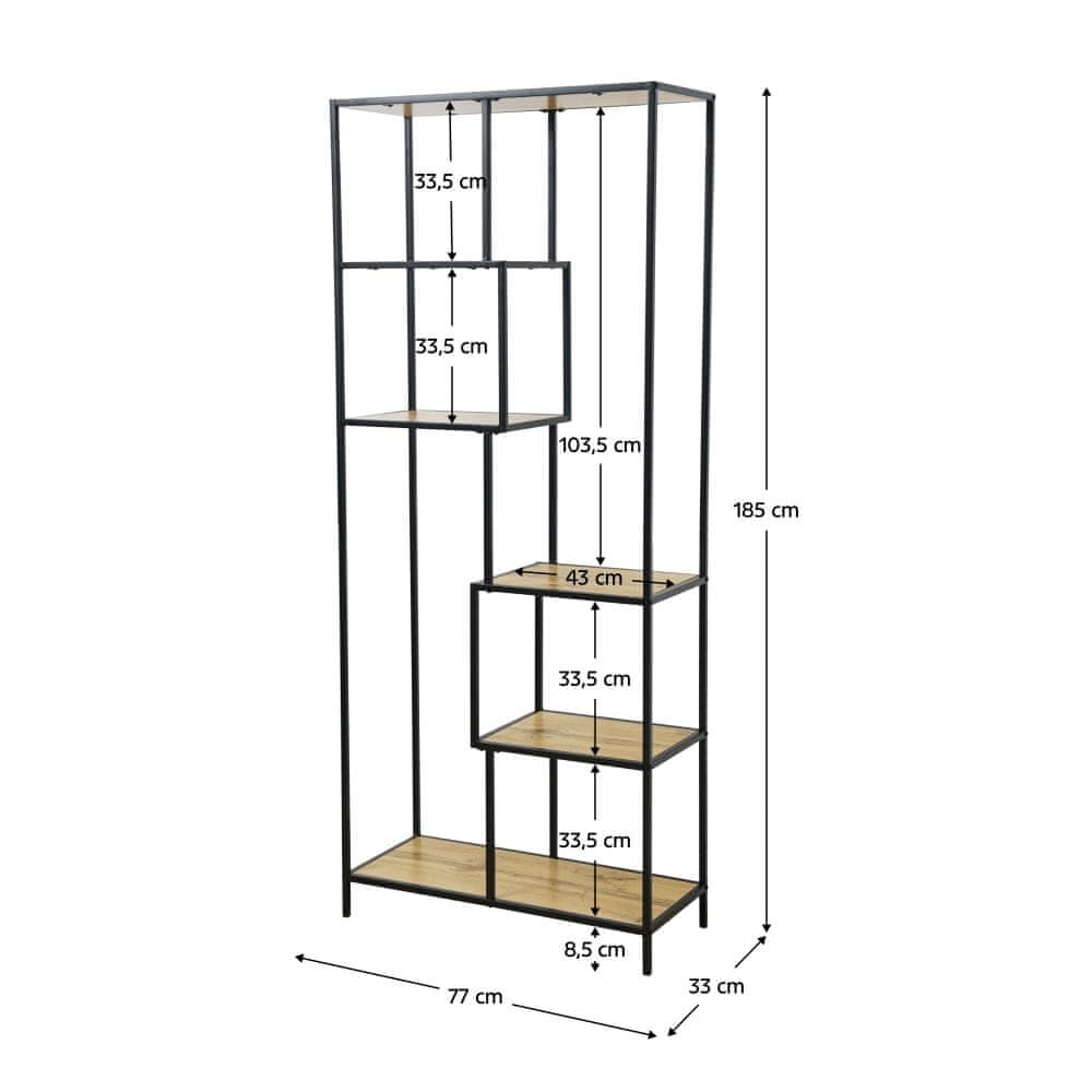 Z višino 185 cm, širino 77 cm in globino 33 cm zagotavlja dovolj prostora za shranjevanje v obliki šestih polic. Polica je izdelana iz visokokakovostne kovine in laminiranega MDF-ja, kar zagotavlja njeno stabilnost in dolgo življenjsko dobo. Zaradi svoje konstrukcije je primeren za postavitev v dnevno sobo, spalnico ali delovno sobo, kjer lahko služi kot knjižnica ali prostor za razstavljanje okraskov.