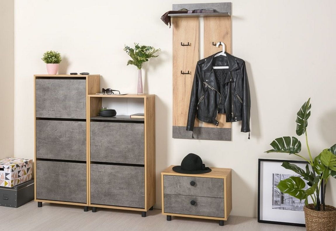 Omarica za čevlje z dvema predaloma je izdelana iz LTD plošče, korpus je v barvi hrastovega kraft zlata, fronte predalov so v barvi temnega kamna. Noge so črne. Ročaji so izdelani iz kovine v črni barvi. Dobavljamo v razstavljenem stanju. PRIDI! Celoten opis