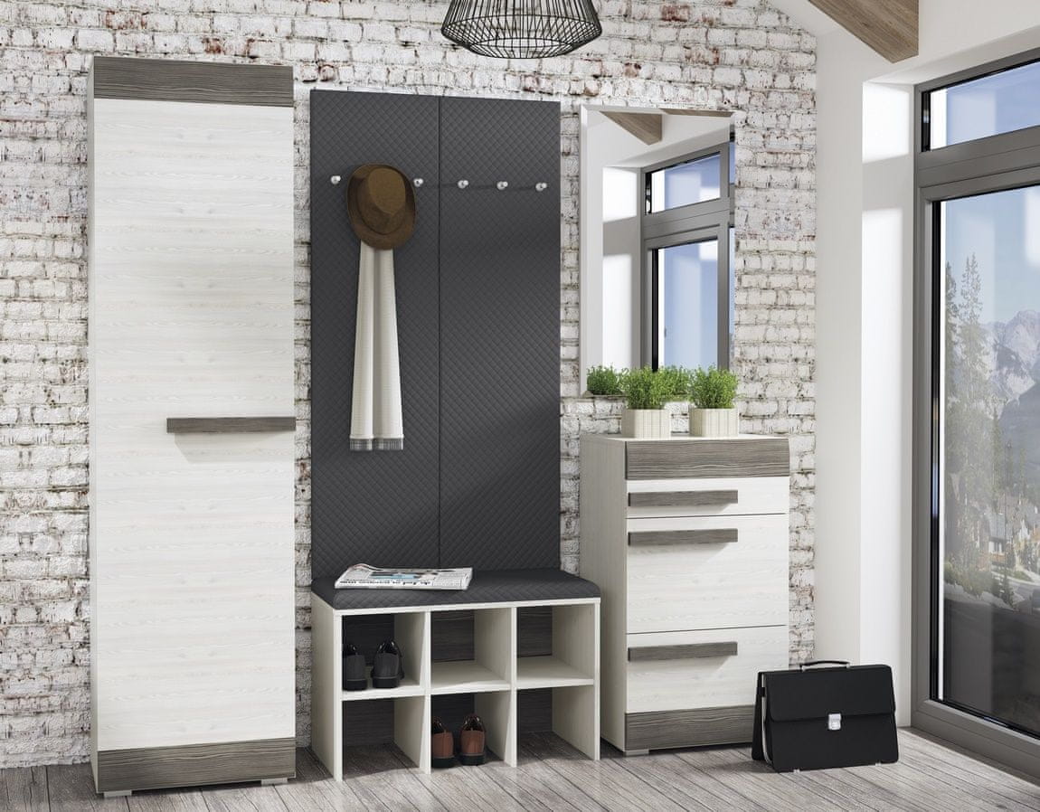 Obešalnik v sodobnem dizajnu, prekrit s sivo tkanino. Obešalnik je izdelan iz visokokakovostne LTD plošče, obrobljene z ABS trakom. Dobavljamo v razstavljenem stanju.