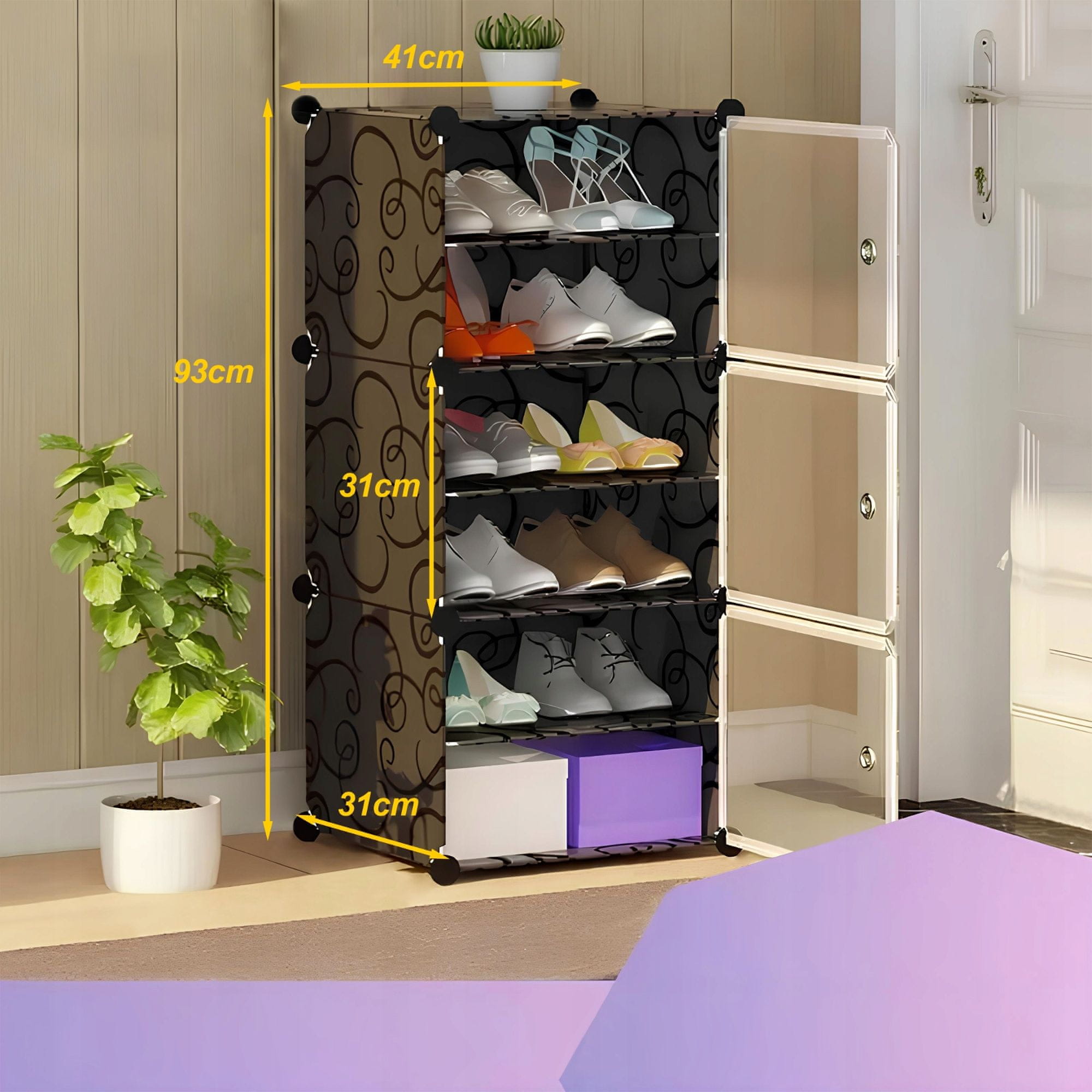 Ta modularna omarica za čevlje je praktičen in sodoben organizator, ki vam omogoča, da ustvarite razporeditev polic, prilagojeno vašim potrebam. Njena elegantna črna oblika s predali, ki jih je mogoče zakleniti, ščiti čevlje pred prahom in olajša red. Idealna je za hodnike, garderobne omare ali majhne prostore, kjer sta funkcionalnost in estetika ključnega pomena.