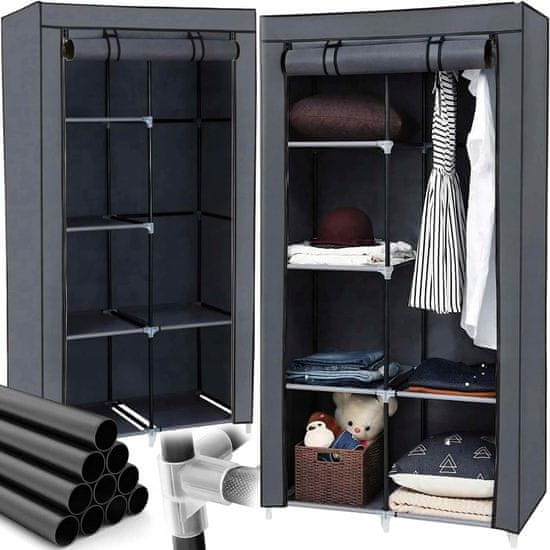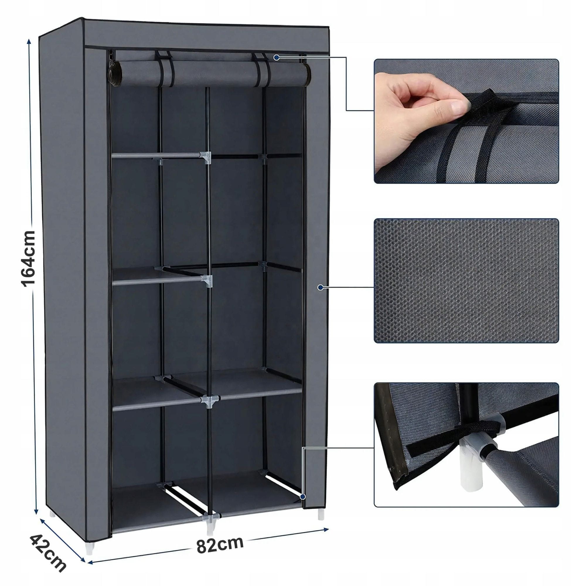 Ta siva tekstilna omara s policami in obešalno palico je praktična rešitev za shranjevanje oblačil doma, v garderobi ali na potovanju. Njena lahka, a stabilna konstrukcija omogoča organizirano shranjevanje oblačil, spodnjega perila in dodatkov. Idealna je za majhne prostore, saj jo je enostavno sestaviti in razstaviti.