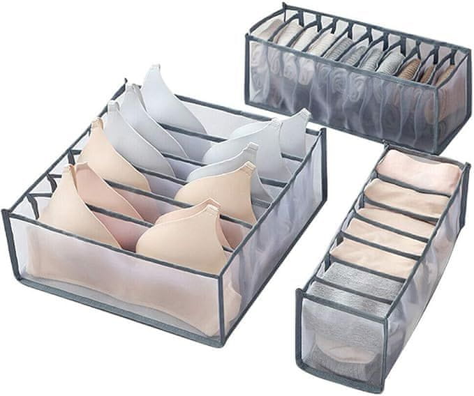 Popoln komplet za organizacijo vseh vrst oblačil: nedrčkov (6 predelkov), nogavic (11 predelkov), spodnjega perila (7 predelkov).