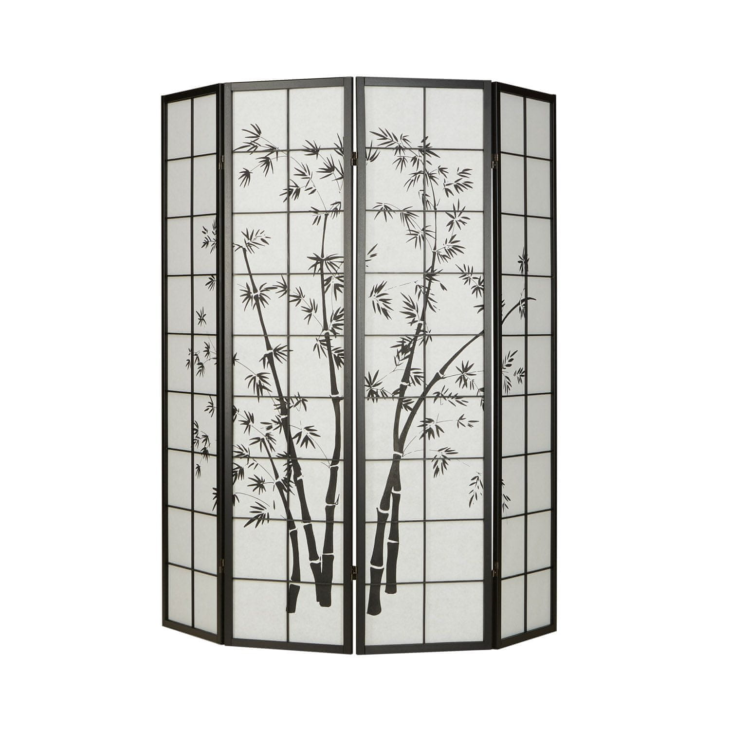 Ta eleganten štiridelni pregradni paravan prinaša prefinjen, naraven pridih v vsak bivalni prostor. Zasnovan za zagotavljanje zasebnosti in stila, je idealen za razdelitev prostorov, ustvarjanje prijetnih kotičkov ali zaščito pred soncem. Njegova japonsko navdihnjena zasnova in okusni bambusov motiv ga naredita za dekorativni poudarek, ki se brezhibno zlije v dnevne sobe, spalnice ali pisarne., Barva (odtenek): Črna, Višina: 179 cm, Globina: 2 cm, Dolžina: 176 cm, Material (podrobno): Les, plošča – Les, Namenjeno za: Odrasle, Število panelov: 4, Vzorec: Enobarven, Bambusov vzorec kot akvarelni motiv na sprednji strani, Neprosojen, a hkrati prepušča svetlobo, Zložljiv, samostoječ, prilagodljiv za uporabo, Dvosmerne tečaje, Primerno za notranjo uporabo kot so dnevna soba, spalnica ali pisarna, Okvir iz borovega lesa, črne barve, Notranja obloga iz visokokakovostnega Shoji riževega papirja z bambusovim motivom, Širina posameznih elementov: 44 cm, Stabilno stoji v poševnem položaju, 4-delni pregradni paravan predhodno sestavljen