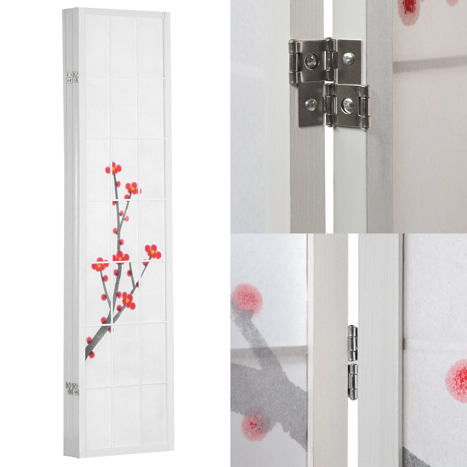 Pregradna stena, 5-delna, stabilna, les, bela, akvarelni motiv češnjevih cvetov, kitajski znaki, neprosojna a prepušča svetlobo, zložljiva, samostoječa, fleksibilna uporaba, dvostranske tečaje, notranja uporaba (dnevna soba, spalnica, pisarna), okvir iz belega borovega lesa, notranja obloga iz visokokakovostnega Shoji riževega papirja z vejami češnjevih cvetov, višina: 179 cm, širina (raztegnjena): 220 cm, globina: 2,0 cm, širina posameznega elementa: 44 cm, stabilno stoji pod kotom, barva (odtenek): rdeča, barva (odtenek): bela, material (podrobno): les, plošča – les, namenjeno za: odrasle, število panelov: 5, vzorec: cvetlični