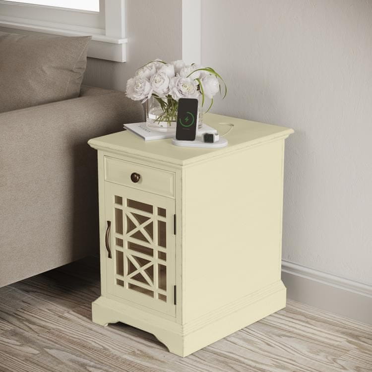 Avola AV675–22, nočna omarica, akacijev les, MDF, krem barva, steklena vrata z okrasnimi prečkami, 1 predal, vgrajena vtičnica in USB, kovinski ročaji, fiksna mizna plošča, brez LED, sestavljena, lesena vodila, trakaste tečaje, teža 15,5 kg, dimenzije (Š x V x G): 41 × 64 × 56 cm, višina 64 cm, globina/širina 56 cm, dolžina 41 cm, dodatne dimenzije (cm): predal – 24,5 × 28,5 × 5,5; vrata – 30,5 × 39,5; omarica – 30,5 × 49,5 × 39,5; fiksna površina mizne plošče – 40,5 × 44,5, namenjeno odraslim, tip lesa: akacija, material (podrobno): les, plošča – les, število vrat: 1, število predalov: 1 predal, barva: krem, glavna barva (filter): krem, modularnost: fiksna, brez LED