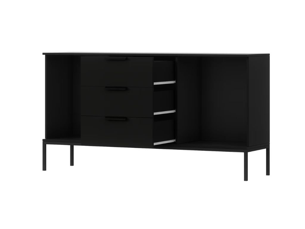 V svoj dom vnesite slog in funkcionalnost zahvaljujoč dobro premišljeni rešitvi za shranjevanje, ki združuje estetiko in praktičnost. Komoda je odlična kot eleganten dodatek dnevni sobi, delovni sobi ali hodniku, njena kombinacija omaric, predalov in odprtega prostora pa omogoča poljubno razporeditev okraskov, knjig ali vsakdanjih potrebščin. Zahvaljujoč čistemu dizajnu v črni barvi bodo izstopali tudi minimalistični dodatki, sveče ali rastline, ki bodo notranjosti dodali edinstven značaj. Kar najbolje izkoristite vsak prostor in ustvarite okolje, ki odraža vaš slog in potrebe.