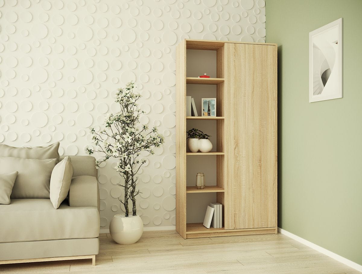 Enovratna polica SUFER zagotavlja dovolj prostora za obešanje oblačil in shranjevanje manjših predmetov, knjig ali dodatkov. Izdelan je iz visokokakovostnih materialov z dimenzijami (ŠxGxV): 90×38×180 cm. Na desni strani regala so vratca, za katerimi je obešalna palica, nad katero je polica, leva stran regala pa ponuja odprt odlagalni prostor, razdeljen s štirimi policami. Lep in zelo priljubljen dizajn v barvi hrasta sonoma se popolnoma prilega vsakemu notranjemu dizajnu, deloval bo harmonično in pomirjujoče. Sufer je narejen tako, da zagotavlja veliko prostora za vsak dom, njegova velikost pa omogoča, da se prilega v skoraj vsak prostor doma ali pisarne. Dostavljen je razstavljen.
