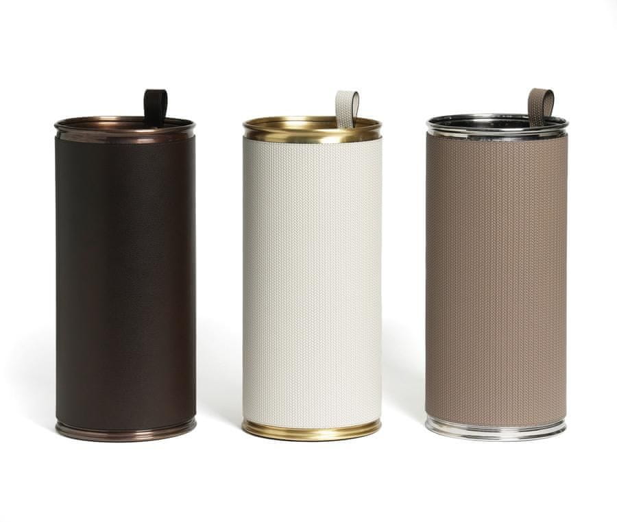 Zelo elegantno usnjeno stojalo za dežnike s kromiranim robom in rjavo sivim pletenim usnjem. Višina stojala 48 cm, premer 22 cm. Celoten opis