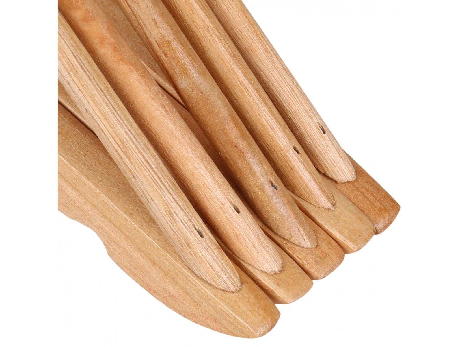 Komplet svetlo rjavih lesenih obešalnikov, ki imajo posebne kavlje za obešanje oblačil na naramnicah, kar preprečuje njihovo nadležno padanje. Obešalniki so zelo univerzalni, na njih lahko obesite hlače, srajce, obleke in številne druge kose vaše garderobe. Popolnoma se prilegajo vsaki omari in trgo Celoten opis