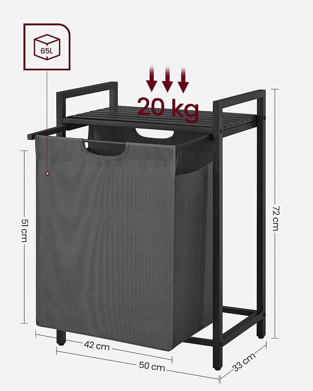 Opis izdelka blagovne znamke OSKAR: KOŠARICA ZA PERILO, SPODNJE PERILO, POSODA ZA BRISAČE, SIVA, ENOKAMORNA, 65 L. Praktična, enokomorna košara za perilo in spodnje perilo s prostornino 65 l je izdelana iz zelo lepih letvic iz MDF plošče, ki so med seboj povezane z jeklenim okvirjem. Pravilna izbira materialov naredi izdelek odporen na morebitne poškodbe. Posodo lahko uporabljate v pralnici, kopalnici ali celo v otroški sobi kot košaro za igrače. V svoj dom vnesite red še danes z enokomornim smetnjakom. Zaradi svoje vsestranskosti in praktičnosti bo košara postala eden vaših najljubših kosov pohištva v vašem domu. Pohištvo v slogu podstrešja je najnovejši trend. Košara se bo zagotovo podala v dekor mnogih sob. Jeklena konstrukcija zagotavlja stabilnost pohištva. Popolnoma vgrajeni elementi okvirja in črn zgornji okvir bodo vaši notranjosti dodali čar. Poskrbite za estetiko vaše kopalnice, pralnice ali otroške sobe z izbiro preverjenih izdelkov najvišje kakovosti. SPECIFIKACIJA Barva: siva, črna Material: MDF plošča, jekleno ogrodje, blago Oxford Dimenzije: 50 × 33 × 72 cm (širina x globina x višina) Dimenzije košare: 42 × 30 × 51 cm (širina x globina x višina) Teža: 4,7 kg Največja obremenitev pohištva: 30 kg Največja obremenitev košare: 10 kg Največja obremenitev plošče: 20 kg Izdelek za samostojno montažo OPOMBE PROIZVAJALCA: – Zaradi nevarnosti se otroci ne smejo igrati z izdelkom ali plezati po njem. – Za dodatno varnost in stabilnost pritrdite pohištvo s priloženim kompletom proti prevračanju. – Prosimo, ne sedite na pultu, saj se lahko prevrnete. – Pri odstranjevanju košar bodite previdni, saj si lahko priščipnete prste. – Košara ni primerna za pranje v pralnem stroju. Košaro je mogoče prosto izvleči za priročno prenašanje. Če košaro uporabljate kot posodo za igrače, vam bo pomagala slediti otrokovim plišastim živalim. V košari boste zagotovo shranili tudi čiste odeje ali brisače. Košara je pritrjena z ježkom. Nastavljive noge vam bodo pomagale poravnati pohištvo tudi na neravnih tleh. Logistični podatki 1 x SKU 2286 teža 5,6 kg bruto – dimenzije 81 × 9 × 41 cm.