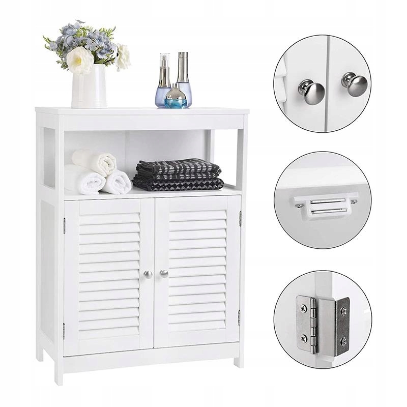 Površina za okrasne predmete ali majhne rastline, odprt predal za pogosto uporabljene kopalniške dodatke in 3-nivojska, po višini nastavljiva polica za brisače ali toaletni papir za vrata omarice.
