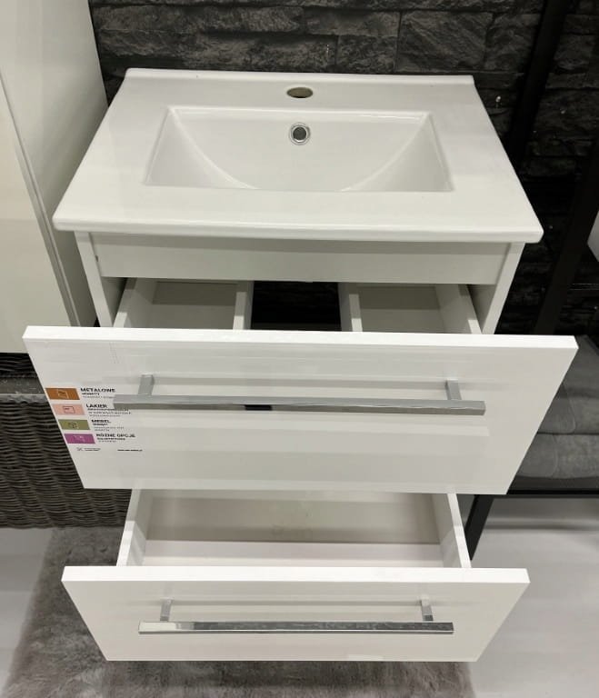 Bela kopalniška omarica s 60 cm umivalnikom. Komplet Pinia, ki ga sestavlja 60 cm omarica za umivalnik z lakirano sprednjo stranjo, je idealen za majhno kopalnico in je funkcionalen kos pohištva, ki bo vizualno povečal prostor in ustvaril dodaten prostor. Komplet Pinia, 60 cm omarica za umivalnik z lakirano sprednjo stranjo, je odlična izbira, če iščete nekaj v univerzalni barvi in slogu, ki se ujema z večino ploščic in armatur. Komplet vsebuje: 60 cm umivalnik in omarico za umivalnik. Ključne značilnosti vključujejo: izdelano iz bele iverne plošče z lakirano sprednjo stranjo, zahteva samostojno montažo, vključuje vse potrebne dodatke, ima moderno, kompaktno obliko, sprosti prostor za shranjevanje in ima mehanizem za mehko zapiranje. Parametri: ⚪️ Uporaba: Kopalniško pohištvo ⚪️ Prevladujoča barva: Bela ⚪️ Višina omarice: 50 cm ⚪️ Širina omarice: 60 cm ⚪️ Skupna širina umivalnika: 60 cm ⚪️ Skupna dolžina umivalnika: 50 cm ⚪️ Globina omarice: 45,6 cm ⚪️ Dolžina umivalnika: 26,5 cm ⚪️ Širina umivalnika: 41 cm ⚪️ Globina umivalnika: 12 cm ⚪️ Način montaže: Za samostojno montažo ⚪️ Število predalov: 2 ⚪️ Vrsta umivalnika: Keramika ⚪️ Lakirano: Da ⚪️ Vrsta korpusa: 16 mm bela iverna plošča ⚪️ Material sprednje strani: 16 mm iverna plošča, bel sijajni lak ⚪️ Teža: ~31 kg ⚪️ Barva sprednje strani: Bel sijaj ⚪️ Barva korpusa: Bela ⚪️ Mehko zapiranje: Da, dimenzije se lahko razlikujejo za +/- 1 cm.