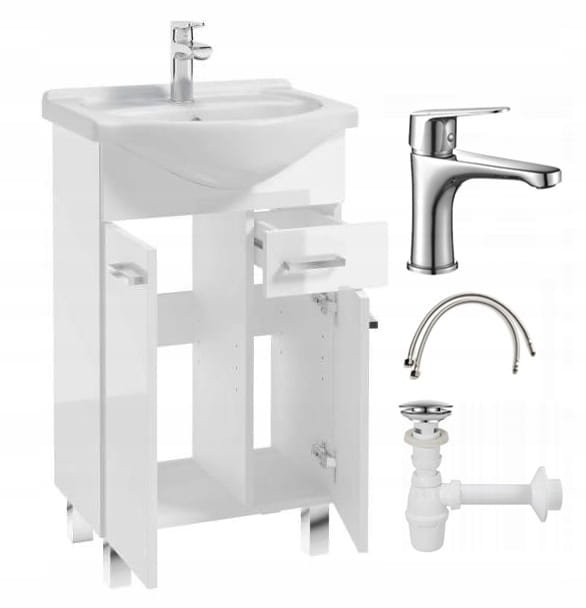 Kopalniška omarica z umivalnikom in pipo z zamaškom, 85×50cm, samostoječa, sijajno bela. Kopalniški komplet Mea je idealna rešitev za manjše kopalnice, saj združuje funkcionalnost z elegantnim slogom. Komplet vključuje omarico z lakirano sprednjo stranjo, umivalnik širine 50 cm, pipo, polsifon in klik-klak zamašek. Kopalniška omarica ne le vizualno poveča prostor, temveč nudi tudi dodaten prostor za shranjevanje, kar je še posebej pomembno v kompaktnih notranjostih. Univerzalna oblika in nevtralne barve omogočajo, da se komplet Mea odlično dopolnjuje z različnimi vrstami ploščic in armatur ter v kopalnico vnese harmonijo in sodoben poudarek. Komplet vključuje: ✅ umivalnik širine 50 cm, ✅ omarico za umivalnik, ✅ kromirano podaljšano enoročno pipo, ✅ polsifon. ✅ klik-klak kromiran zamašek za umivalnik. Ključne značilnosti te kopalniške omarice: ✅ Izdelana iz bele iverne plošče z moderno, lakirano sprednjo stranjo. ✅ Zasnovano za samostojno montažo, s celotnim kompletom montažnih dodatkov. ✅ Kompaktna in elegantna oblika, idealna za majhne kopalnice. ✅ Zagotavlja priročen in praktičen prostor za shranjevanje. Parametri: ✅ Uporaba: Kopalniško pohištvo ✅ Prevladujoča barva: Bela ✅ Vrsta omarice: prostostoječa ✅ Višina omarice (cm): 80 cm ✅ Širina omarice (cm): 46 cm ✅ Globina omarice: 30 cm ✅ Globina umivalnika: 42,5 cm ✅ Dolžina umivalnika: 49,5 cm ✅ Višina omarice z umivalnikom: 86 cm ✅ Način montaže: Za samostojno montažo ✅ Material umivalnika: Keramika ✅ Lakirano: Da ✅ Material korpusa: 16 mm pohištvena plošča, bel sijajni lak ✅ Material sprednje strani: 16 mm pohištvena plošča, bel sijajni lak ✅ Teža: 20 kg ✅ Noge: da ✅ Barva sprednje strani: Bel sijaj ✅ Barva korpusa: Bel sijaj ✅ Priložena pipa: Da ✅ Priložen polovični sifon: Da ✅ Domet izliva: 12 cm ✅ Višina izliva: 16,5 cm
