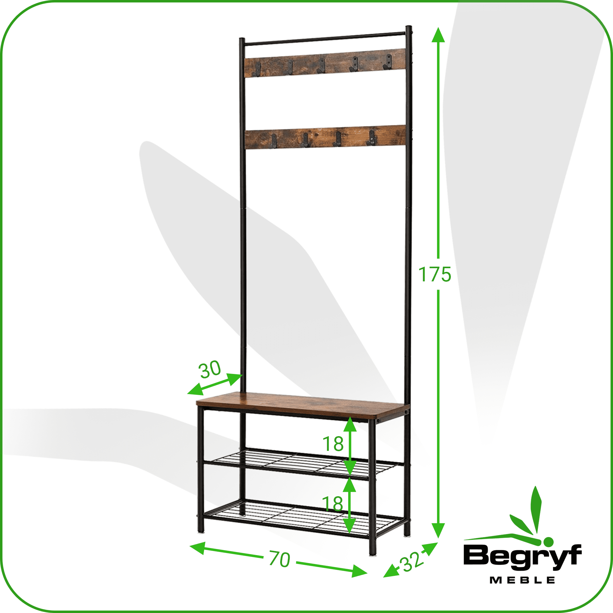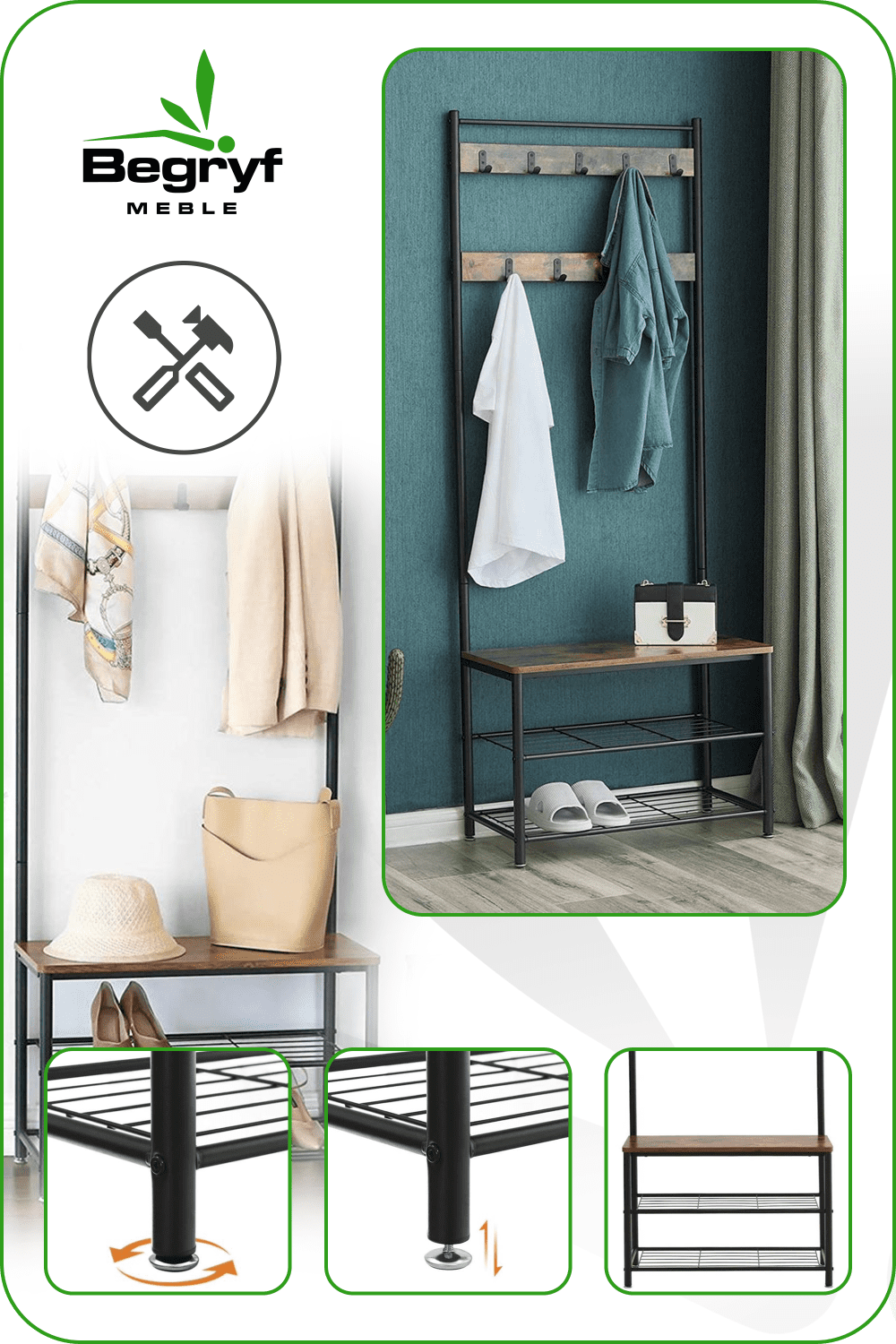 Funkcionalni sedež omogoča enostavno obuvanje in sezuvanje čevljev, dodatni dve kovinski polici spodaj pa sta idealni za shranjevanje čevljev ali dodatkov. Zahvaljujoč kompaktnim dimenzijam (70 × 32 × 175 cm) se obešalnik prilega tudi manjšim prostorom, hkrati pa ponuja odlično funkcionalnost.