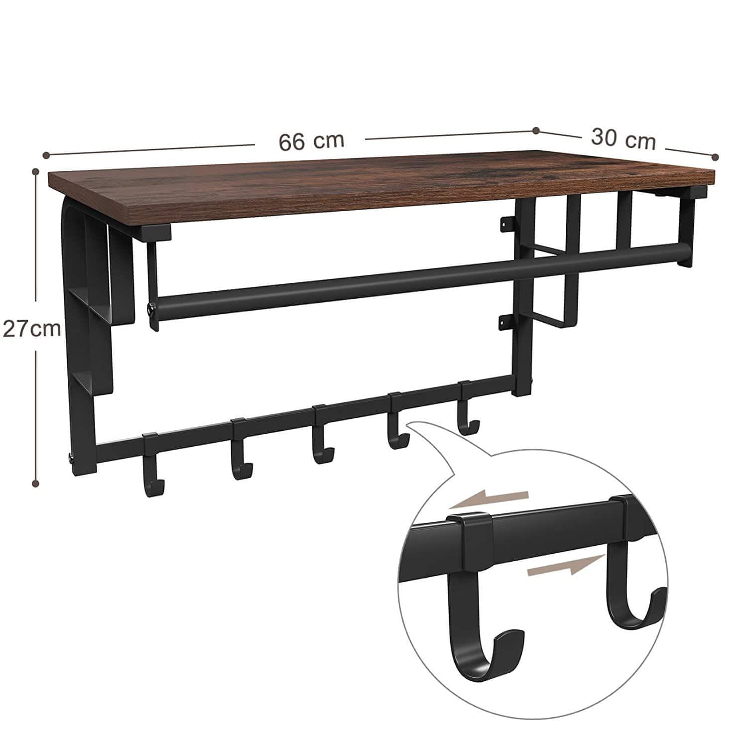 Opis izdelka blagovne znamke OSKAR: Ste naveličani nereda na hodniku ali v predsobi? Jakne in plašči, ki ležijo na stolih in naslanjačih v dnevni sobi in jedilnici namesto na obešalniku? Če je odgovor pritrdilen, ste prišli na pravo mesto. Predstavljamo vam visečo stensko polico, ki bo prinesla red in urejenost. Ta praktičen kos pohištva bo organiziral vaša vrhnja oblačila, galanterijo in druge manjše predmete, kot so ključi. Ta izdelek, ki prihrani prostor, ima stabilno polico, na katero lahko postavimo lončnice, dežnike, nahrbtnike, klobuke, kape ali preprosto postavimo svoje lepo uokvirjene fotografije. Poleg tega je izdelek opremljen s 5 kavlji za shranjevanje plaščev, jaken, torb ali ključev in stabilno palico, na katero lahko obesimo jakne in plašče, nameščene na obešalniku za oblačila. Kovinski okvir zagotavlja stabilnost pohištva, zato je idealen izdelek za vsak letni čas, še posebej pozimi, ko na kljuke ali palico obešamo težke jakne in plašče. Tudi šali, rute in kapuce bodo našli svoje mesto na ograji. Popolnoma usklajeni elementi polic in rustikalna lesena polica bodo vaši notranjosti dodali čar. Poskrbite za estetiko vašega hodnika, hodnika, pisarne ali kopalnice z izbiro preverjenih izdelkov najvišje kakovosti. SPECIFIKACIJA: Barva: rustikalna rjava, črna Material: iverka, kovina Dimenzije: 66 × 30 × 27 cm (širina x globina x višina) Teža: 4 kg Maks. nosilnost police: 15 kg maks. obremenitev na kavelj: 3 kg Maks. obremenitev palice: 10 kg Izdelek lahko uporabljamo tudi v kopalnici, kjer lahko odložimo brisače, kopalne plašče in kozmetiko za nego telesa. Izdelek je idealen tudi za uporabo v masažnih salonih. Rustikalni videz se bo zagotovo podal v notranjost mnogih kopalnic. Logistični podatki 1 x SKU 2000 teža 4 kg bruto – dimenzije 75 × 38 × 6 cm.
