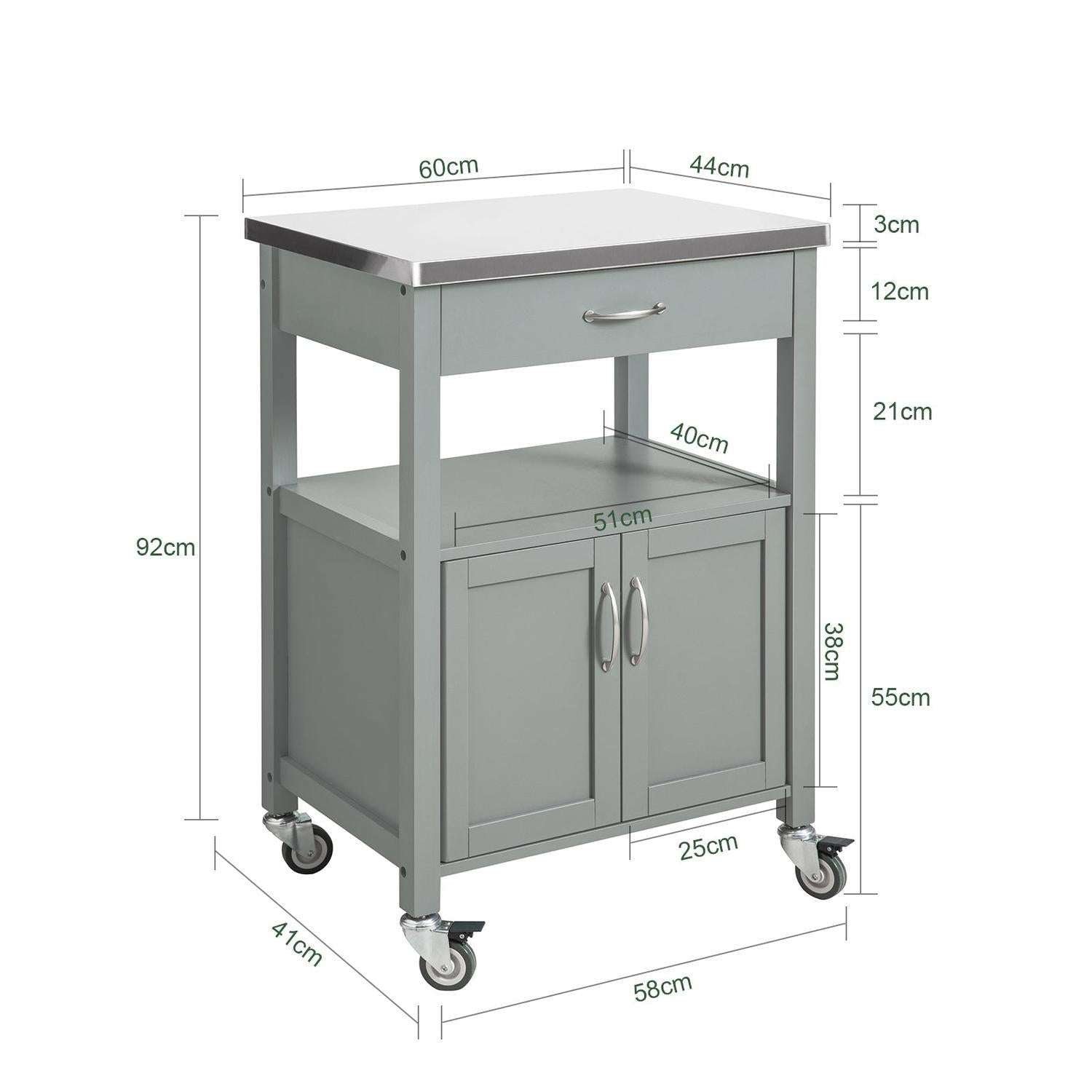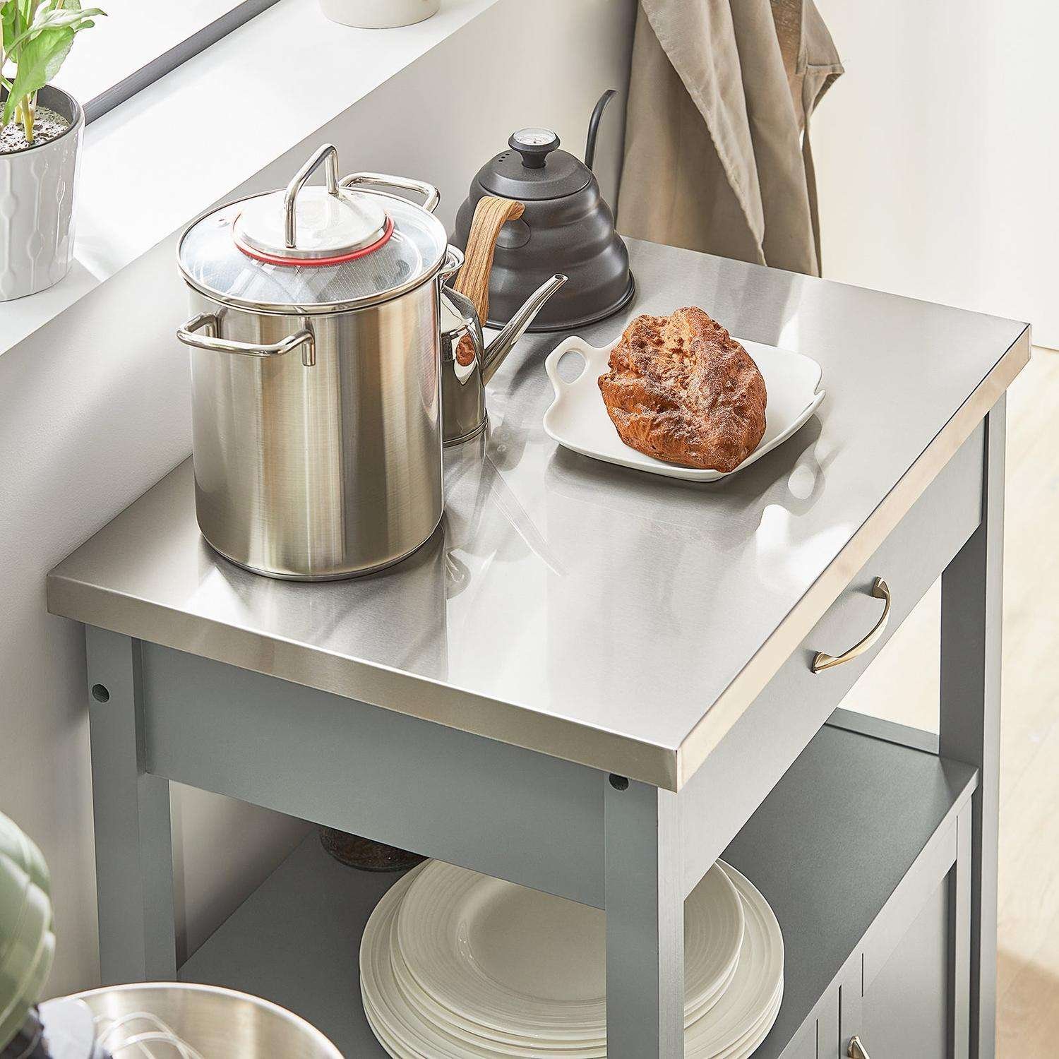 Ta prostostoječi kuhinjski voziček ponuja praktično rešitev za dodatni shranjevalni prostor delovno površino in servirno območje v vaši kuhinji. Njegova gladka površina iz nerjavečega jekla je enostavna za čiščenje medtem ko robustna zasnova in štiri zaklepajoča kolesa omogočajo enostavno premikanje in postavitev kjerkoli jo potrebujete. Idealen za izboljšanje organizacije in prilagodljivosti v kuhinji ta voziček združuje funkcionalnost in priročnost.