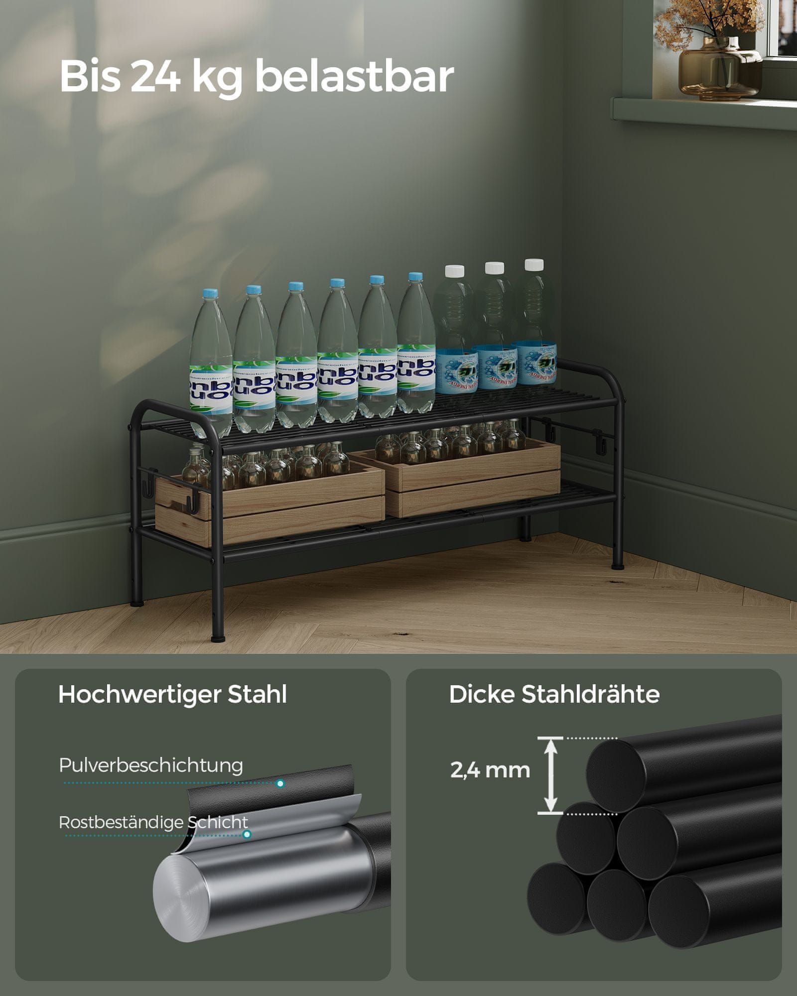 Ta kovinski regal za čevlje ponuja tri nivoje in stranske kljuke za urejen vhod ali hodnik. Njegove nastavljive police omogočajo prilagodljivo shranjevanje več parov čevljev, kar je idealno za urejeno in dostopno organizacijo obutve. Enostavna sestava. Celoten opis