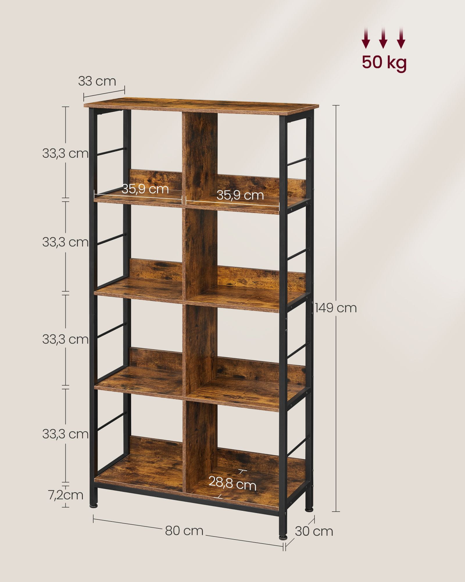 Ta 4-nadstropna knjižna polica ponuja praktično in elegantno shranjevanje za vaše knjige, dekoracijo in osebne predmete. Zasnovana je tako, da dopolnjuje dnevne sobe, pisarne ali spalnice, ustvarja prijeten bralni kotiček in vašemu interierju doda industrijski pridih. Njena robustna konstrukcija zagotavlja stabilnost in vzdržljivost, zato je primerna za organizacijo različnih predmetov.