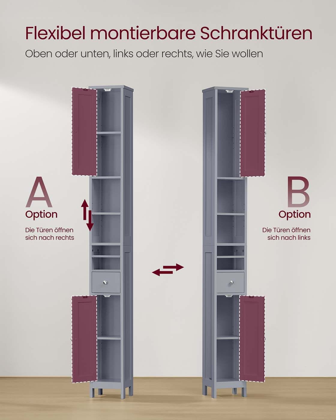 Ta visok, tanek kopalniški kabinet nudi praktičen prostor za shranjevanje v majhnih prostorih. Z nastavljivimi policami, predalom in odprtimi predelki pomaga ohraniti vašo kopalnico urejeno in čisto ter se brezhibno prilega sodobnim notranjim prostorom. Celoten opis