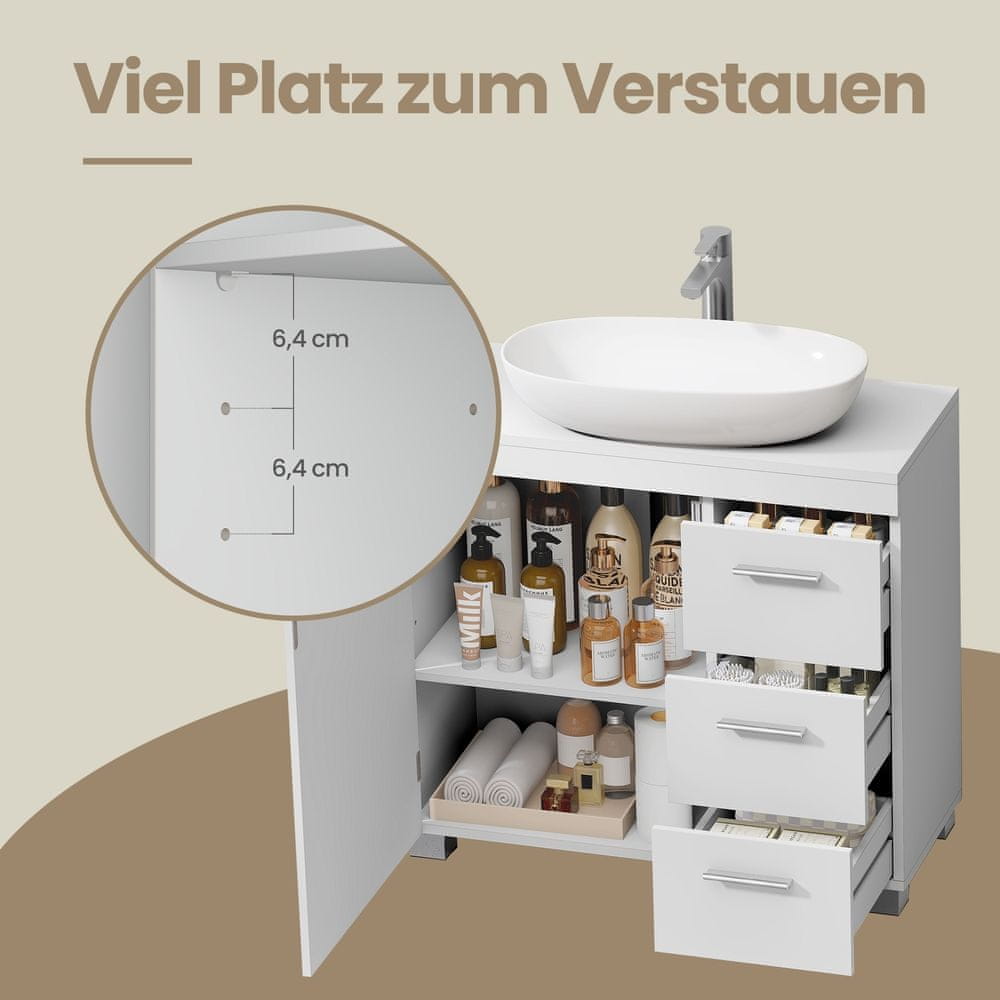 Ta kopalniška omarica je zasnovana za praktično shranjevanje pod umivalnikom kar vam pomaga ohraniti kopalnico urejeno in čisto. Z več velikimi predali in predelki za vrati nudi dovolj prostora za toaletne potrebščine čistilna sredstva in druge potrebščine. Njena sodobna zasnova in nevtralna barva jo naredijo primerno za različne stile kopalnic.