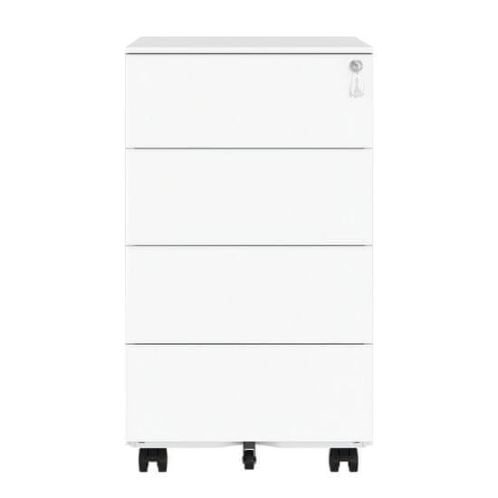 Mobilna predalčna omara zasnovana za učinkovito shranjevanje in organizacijo dokumentov ter pisarniškega materiala v profesionalnih in domačih pisarnah zaklepni predali za varno shranjevanje trpežna konstrukcija za dolgo življenjsko dobo predhodno sestavljena za takojšnjo uporabo Barva: oblačno bela Material: jeklo Velikost: 451 × 39 × 693 cm (D x Š x V) Teža: 20 kg Največja nosilnost na predal: 15 kg