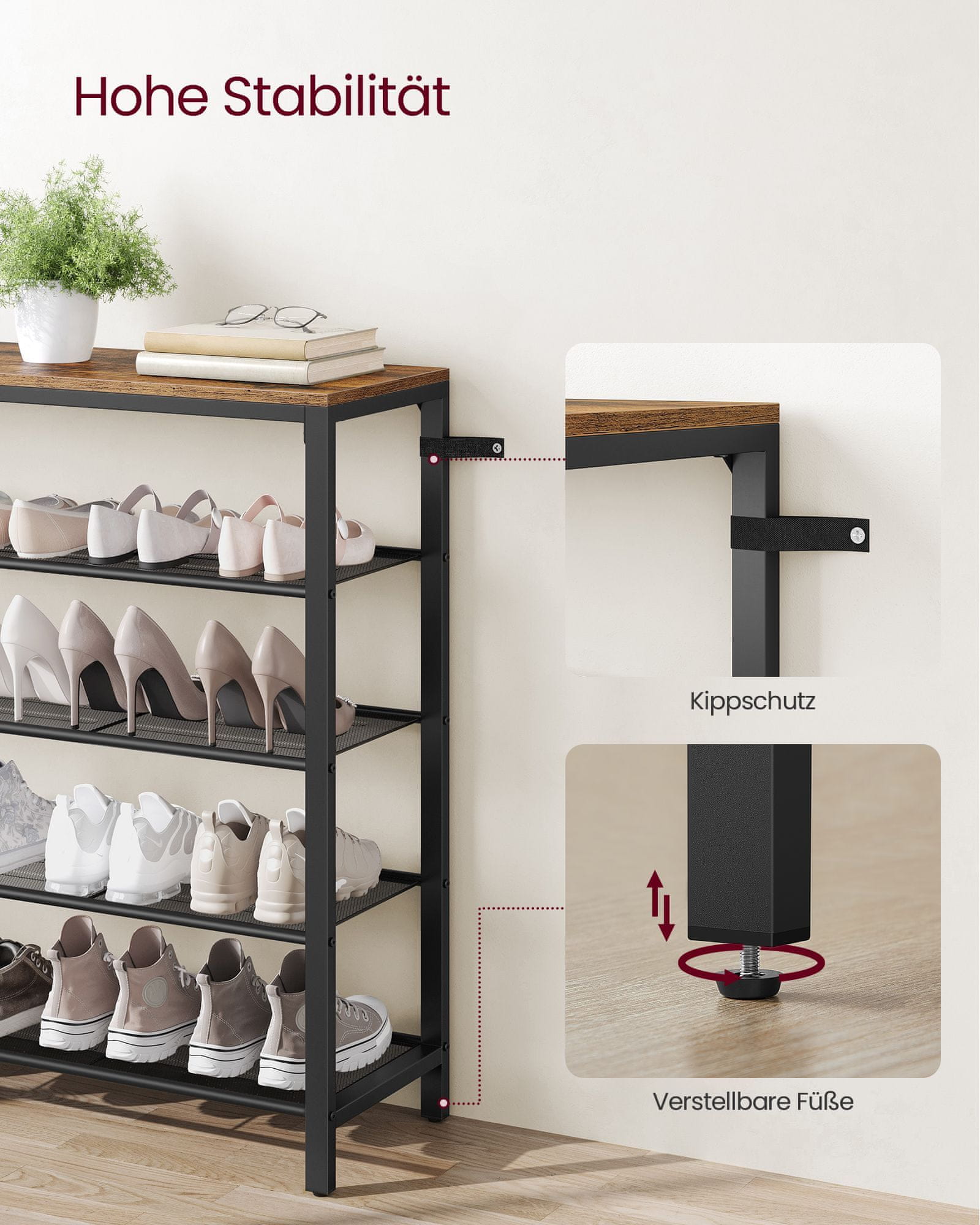 Ta čeveljnik nudi praktično in stilsko rešitev za organizacijo čevljev in torb v vašem vhodu ali hodniku. S svojo industrijsko zasnovo in vintage videzom se brezhibno zlije z različnimi notranjimi slogi hkrati pa zagotavlja dovolj prostora za shranjevanje. Trdna konstrukcija zagotavlja zanesljivo podporo za vašo obutev in dodatke.