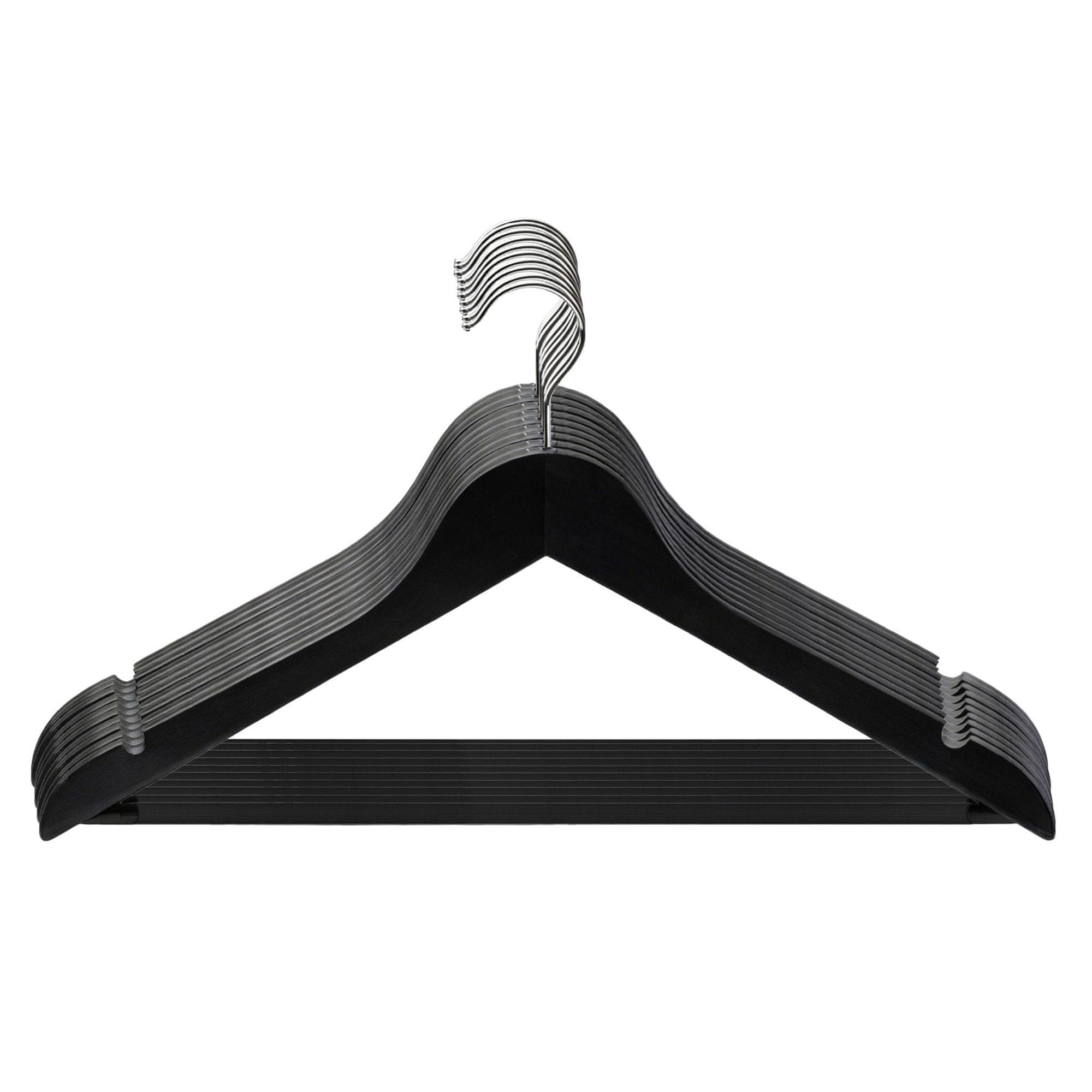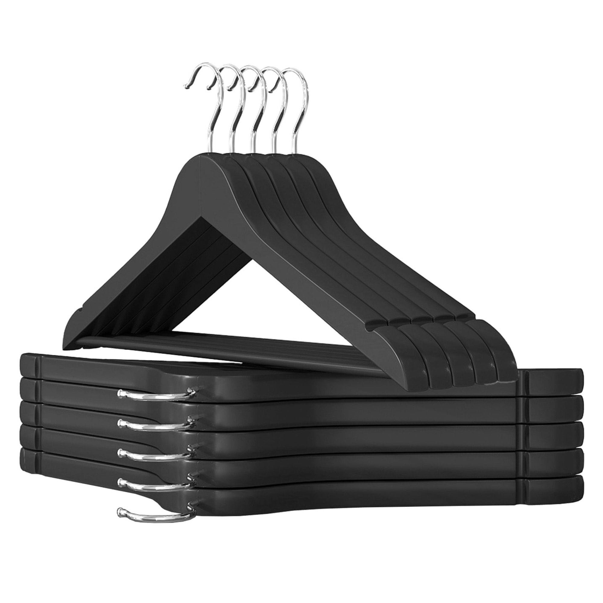 Ti leseni obešalniki nudijo trdno oporo vašim oblačilom, pomagajo ohranjati njihovo obliko in preprečujejo drsenje. Idealni so za organizacijo oblek, srajc in plaščev, saj imajo gladko površino, ki ščiti občutljive tkanine. Popolni za urejeno in pregledno garderobo. Celoten opis