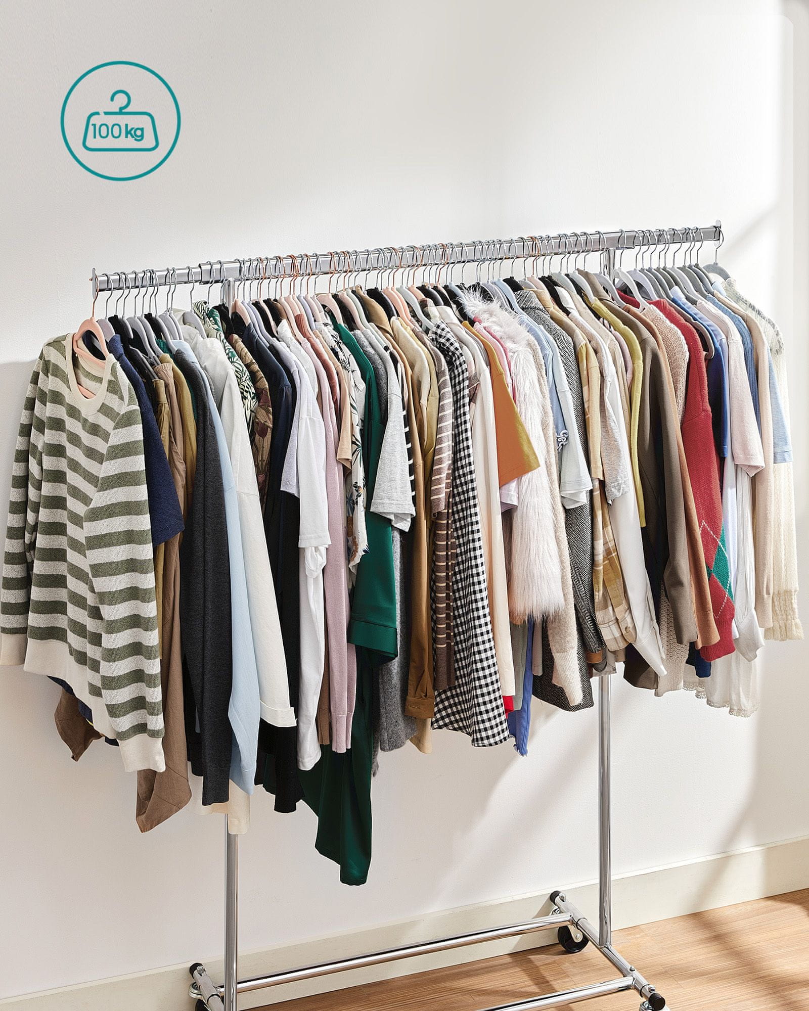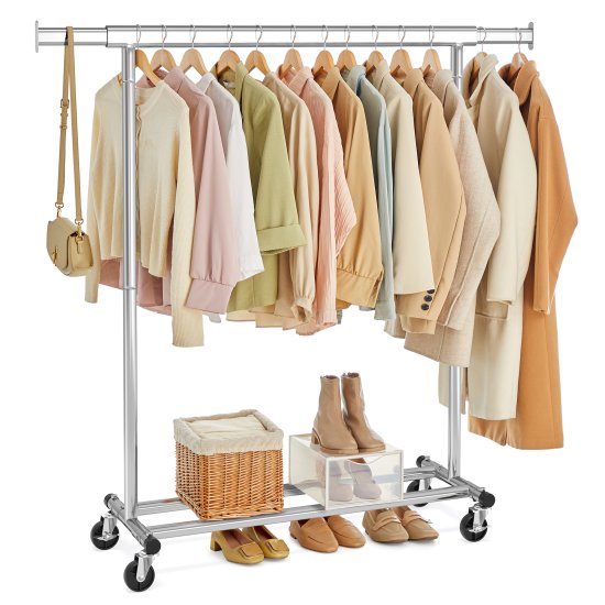 Ta robustna obešalna stojala za oblačila je zasnovana za zanesljivo in vsestransko shranjevanje vaših oblačil in dodatkov. Idealna za uporabo v spalnicah, garderobah ali pralnicah, nudi obilo prostora za obešanje z raztegljivo palico in priročno mobilnost zahvaljujoč vrtljivim kolesom. Njena trdna konstrukcija zagotavlja zanesljivo podporo tudi za težje predmete, zato je primerna za vsakodnevno organizacijo ali sezonsko shranjevanje.