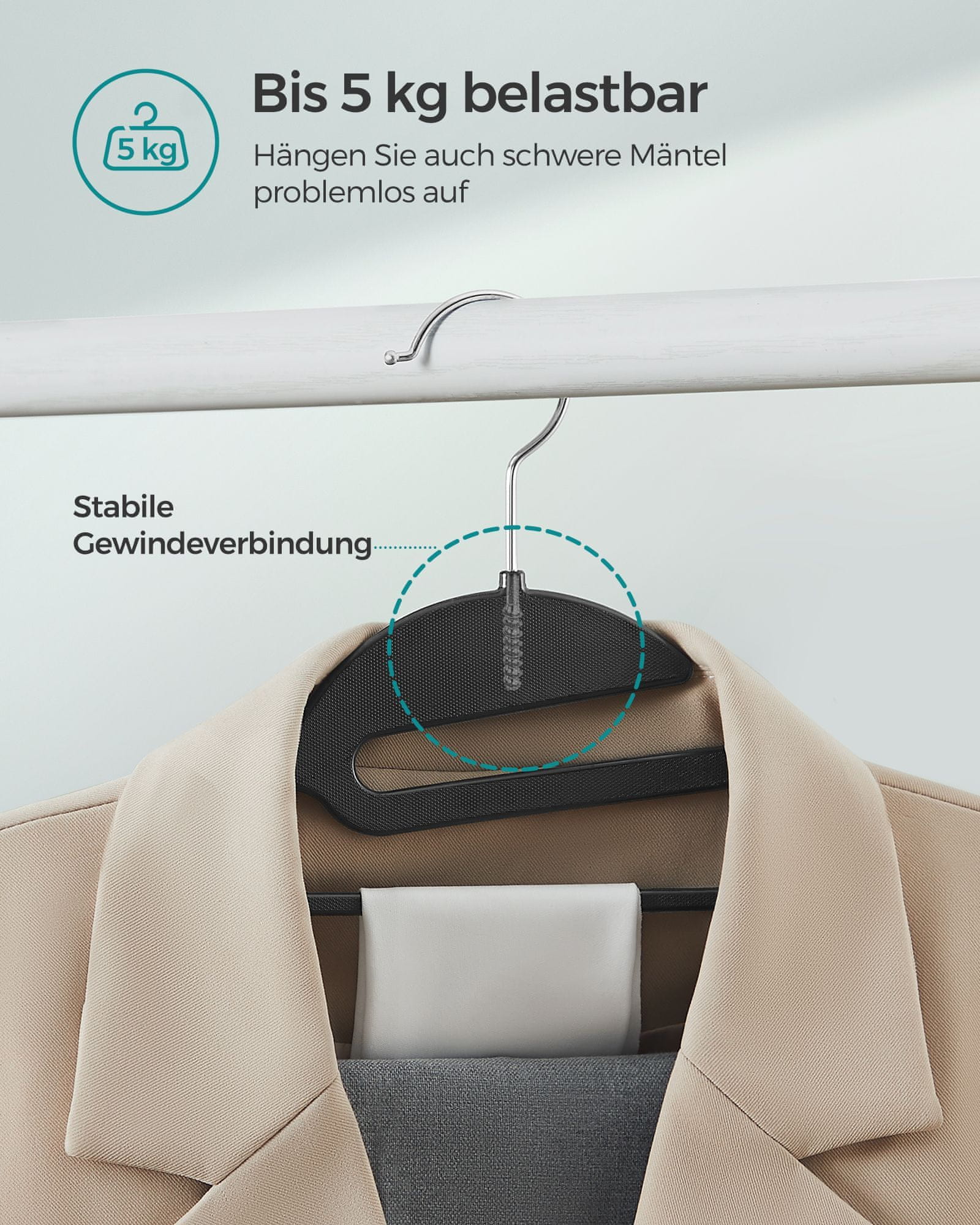 Ti ti plastični obešalniki za obleke so zasnovani za učinkovito organizacijo vaše garderobe ob hkratnem varčevanju s prostorom. Imajo trdno konstrukcijo in nedrseč dizajn zaradi česar so idealni za varno obešanje oblek srajc in drugih oblačil. Kavelj ki se vrti za 360° in S-oblika odprtine zagotavljata dodatno udobje pri vsakodnevni uporabi.