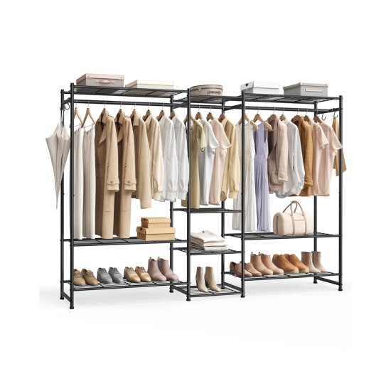 Ta avatud garderoob pakub rohkelt hoiuruumi mitme riiuli ja riidepuuvarrastega, mis sobivad ideaalselt riiete ja aksessuaaride organiseerimiseks magamistoas, elutoas või esikus. Selle tugev metallraam tagab stabiilsuse ja vastupidavuse igapäevaseks kasutamiseks. Celoten opis