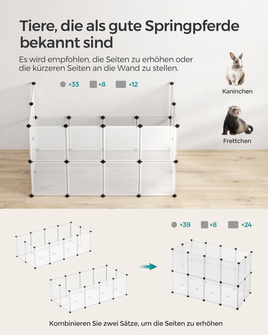 Ta vsestranski majhen ograjen prostor za male živali nudi prostorno in varno okolje za hišne ljubljenčke kot so morski prašički hrčki ali zajci. Oblikovan za enostavno sestavljanje in prilagajanje omogoča ustvarjanje udobnega in varnega prostora prilagojenega potrebam vašega ljubljenčka. Prosojne plošče omogočajo enostavno opazovanje vaših ljubljenčkov hkrati pa zagotavljajo da je ograja enostavna za čiščenje in vzdrževanje.