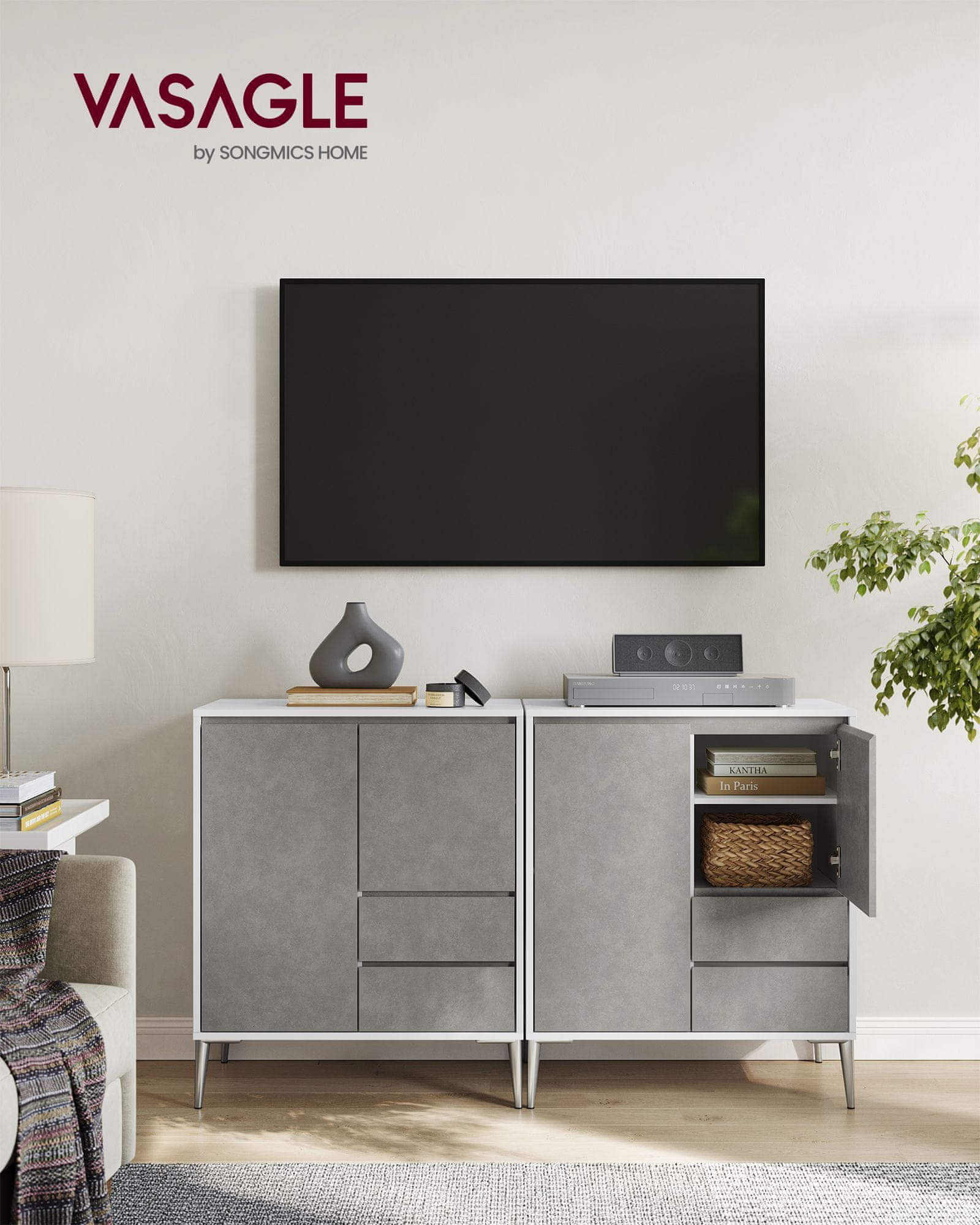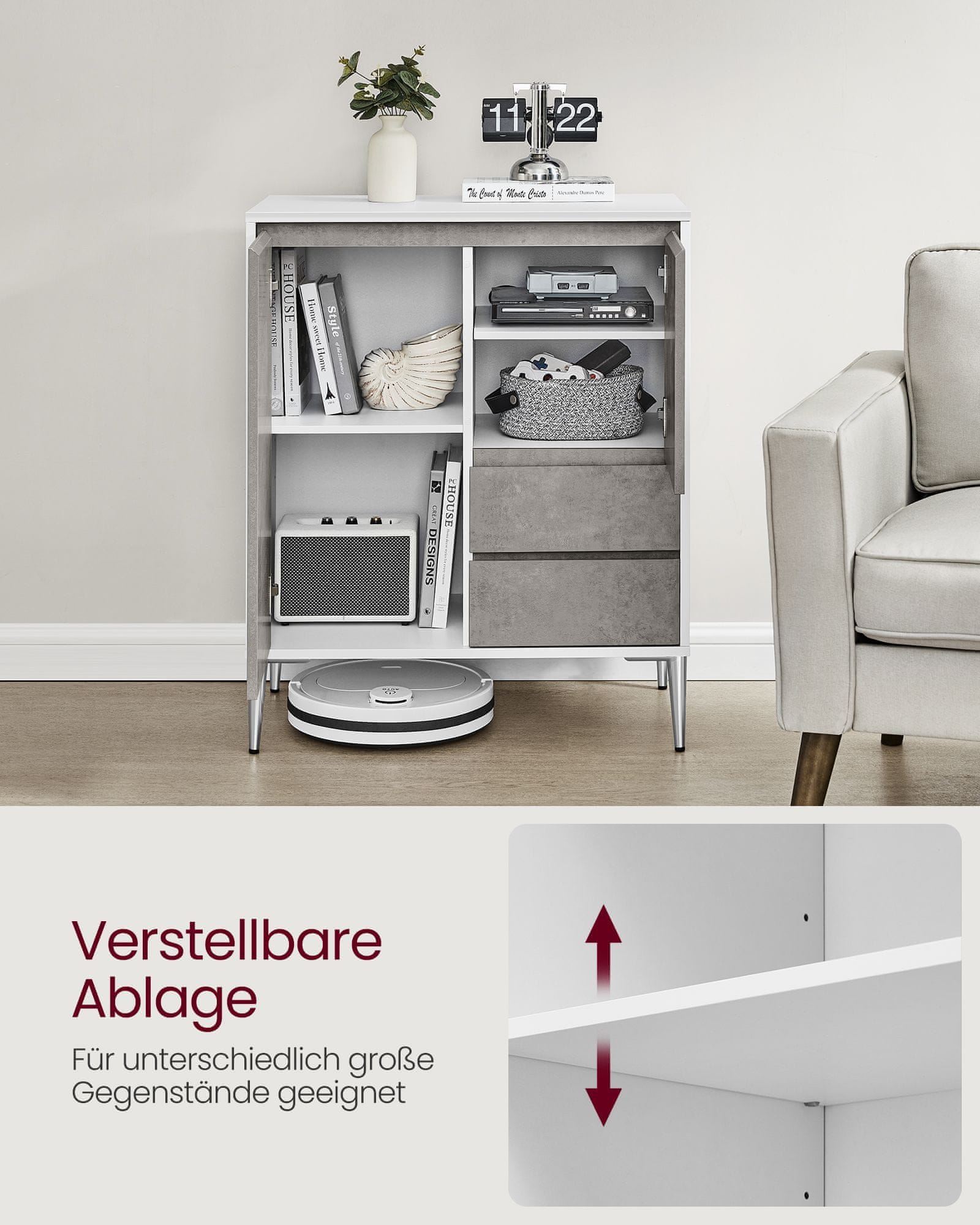 Ta moderni kummut pakub rohkelt hoiuruumi teie kööki või söögitoasse. Reguleeritavate riiulite ja uste taga olevate sahtlitega aitab see teil organiseerida nõusid, söögiriistu ja muud, lisades samal ajal kaasaegse puudutuse teie kodule. Celoten opis